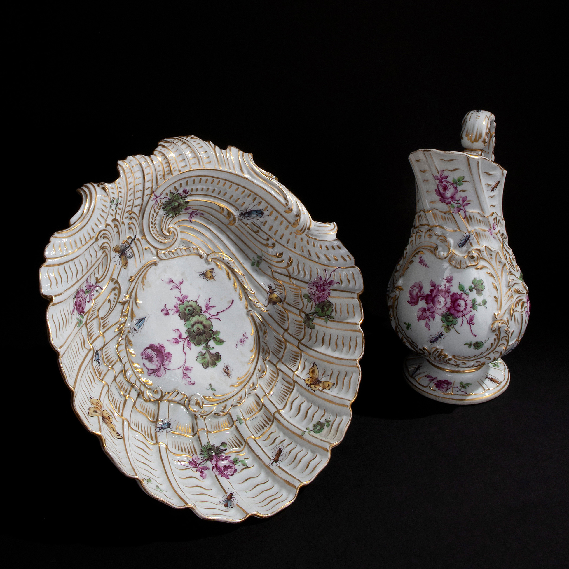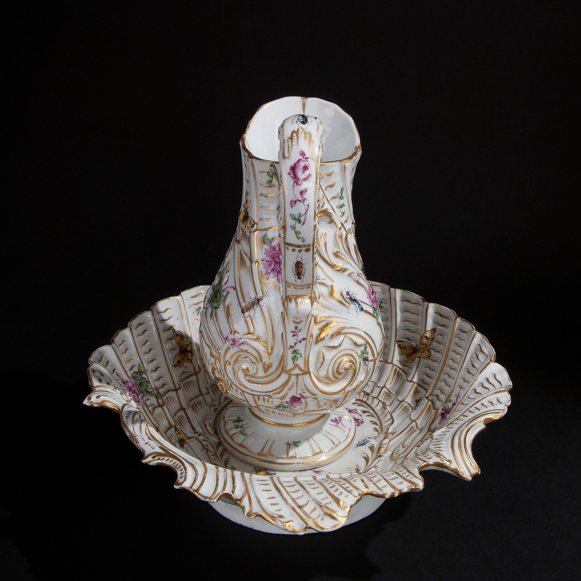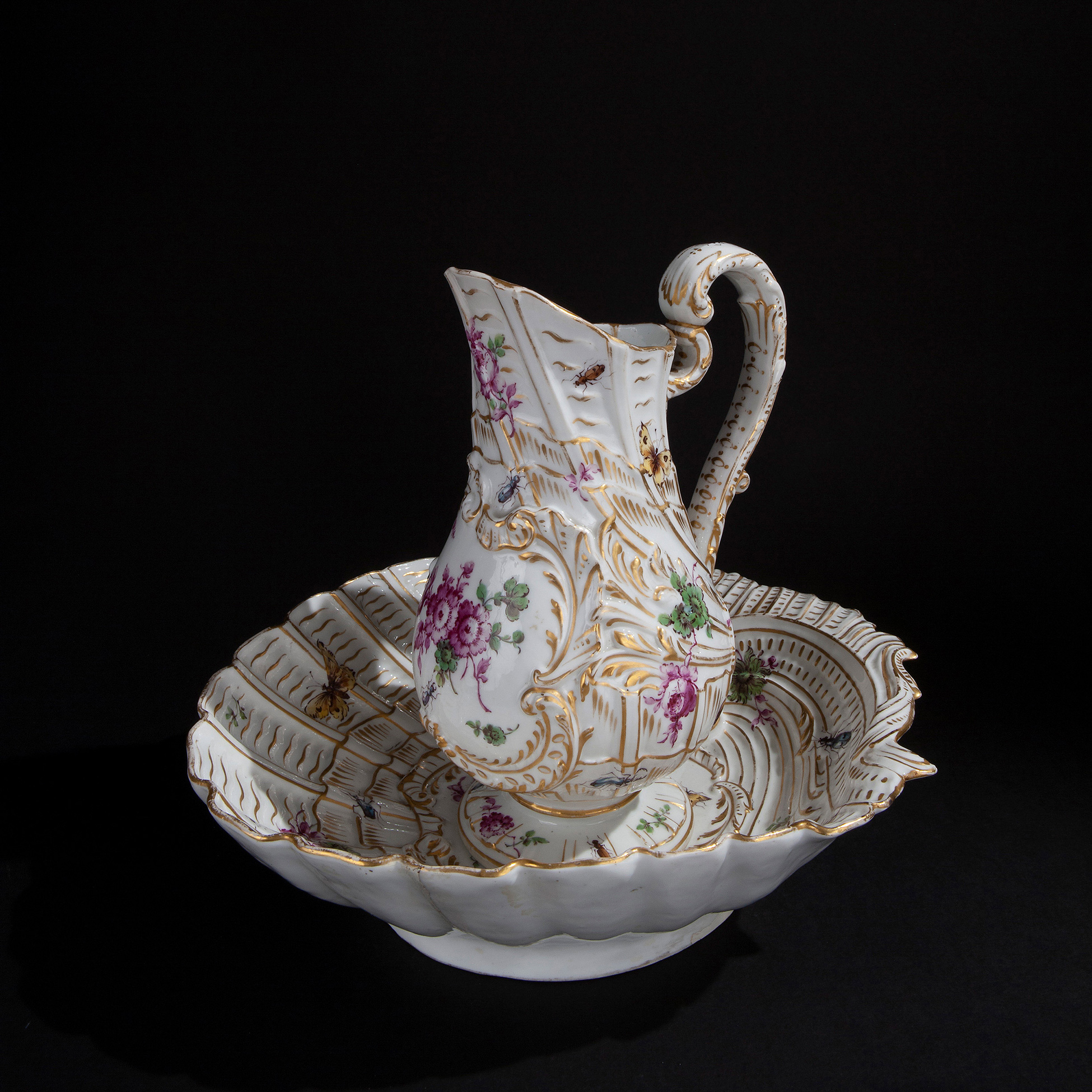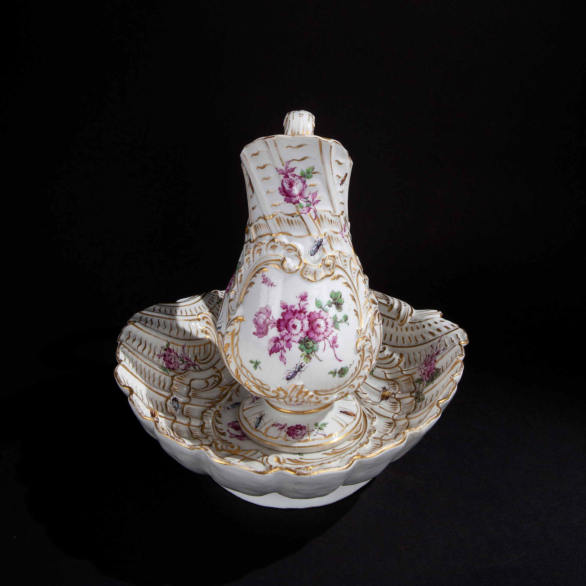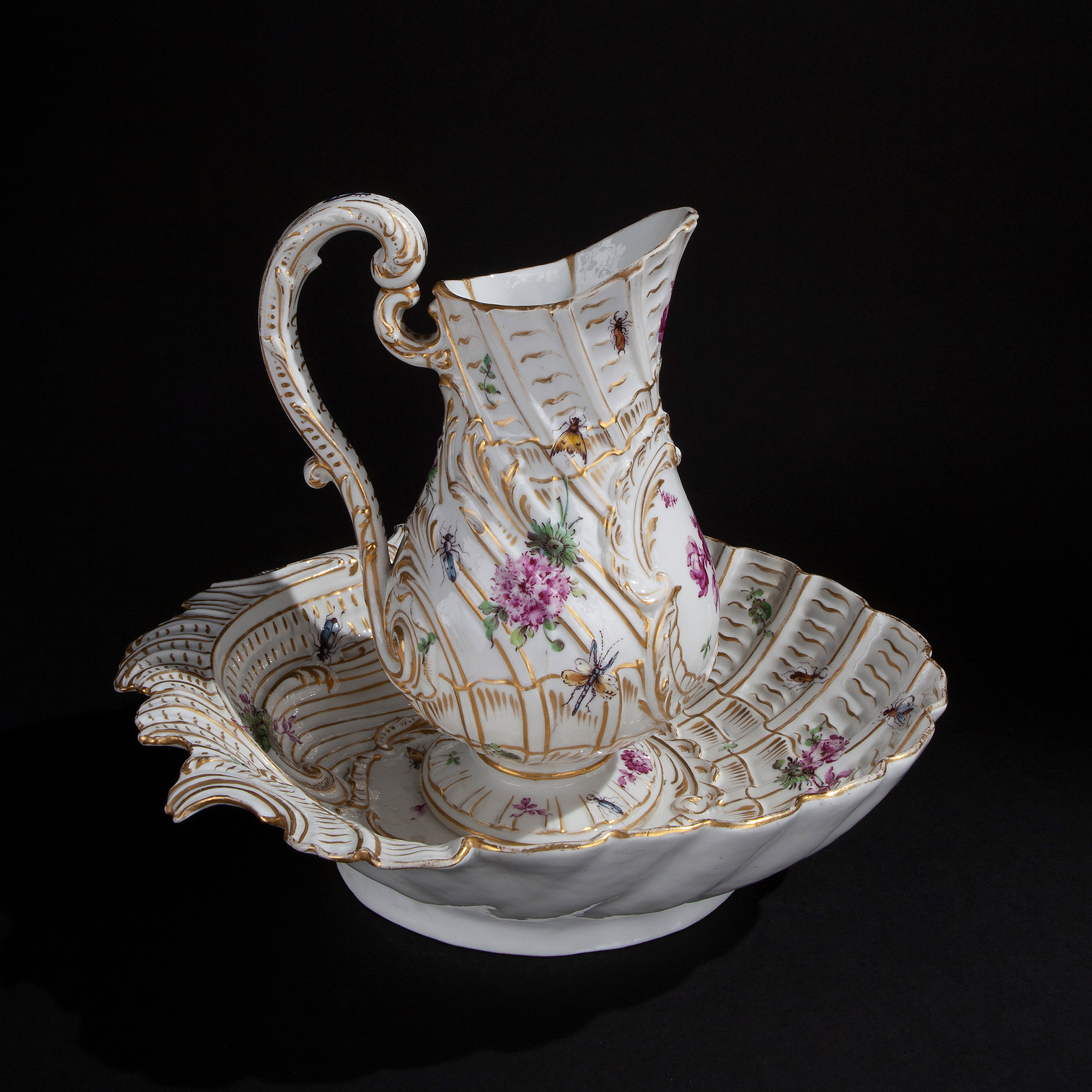 Caraffa e bacile in porcellana, Germania XVIII secolo Manifattura Meissen Dimensioni complessive 35x30,5x26,5 cm.