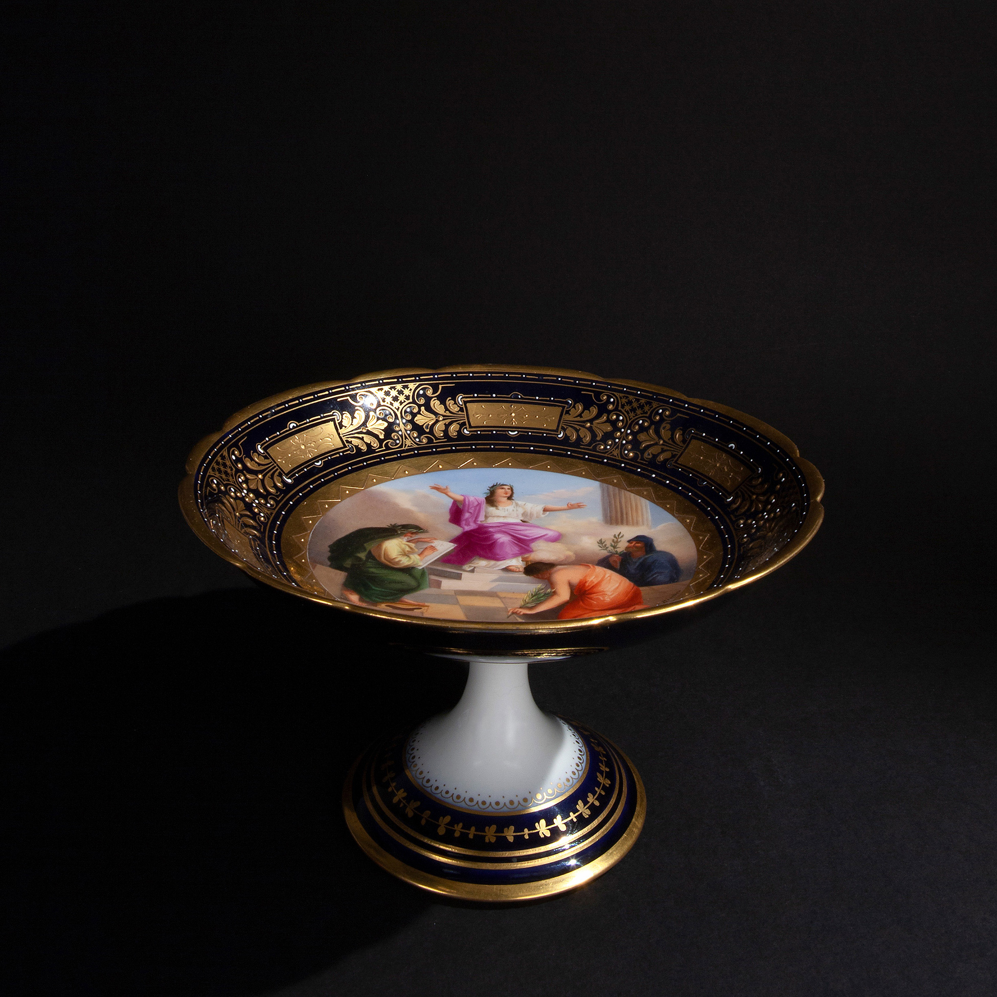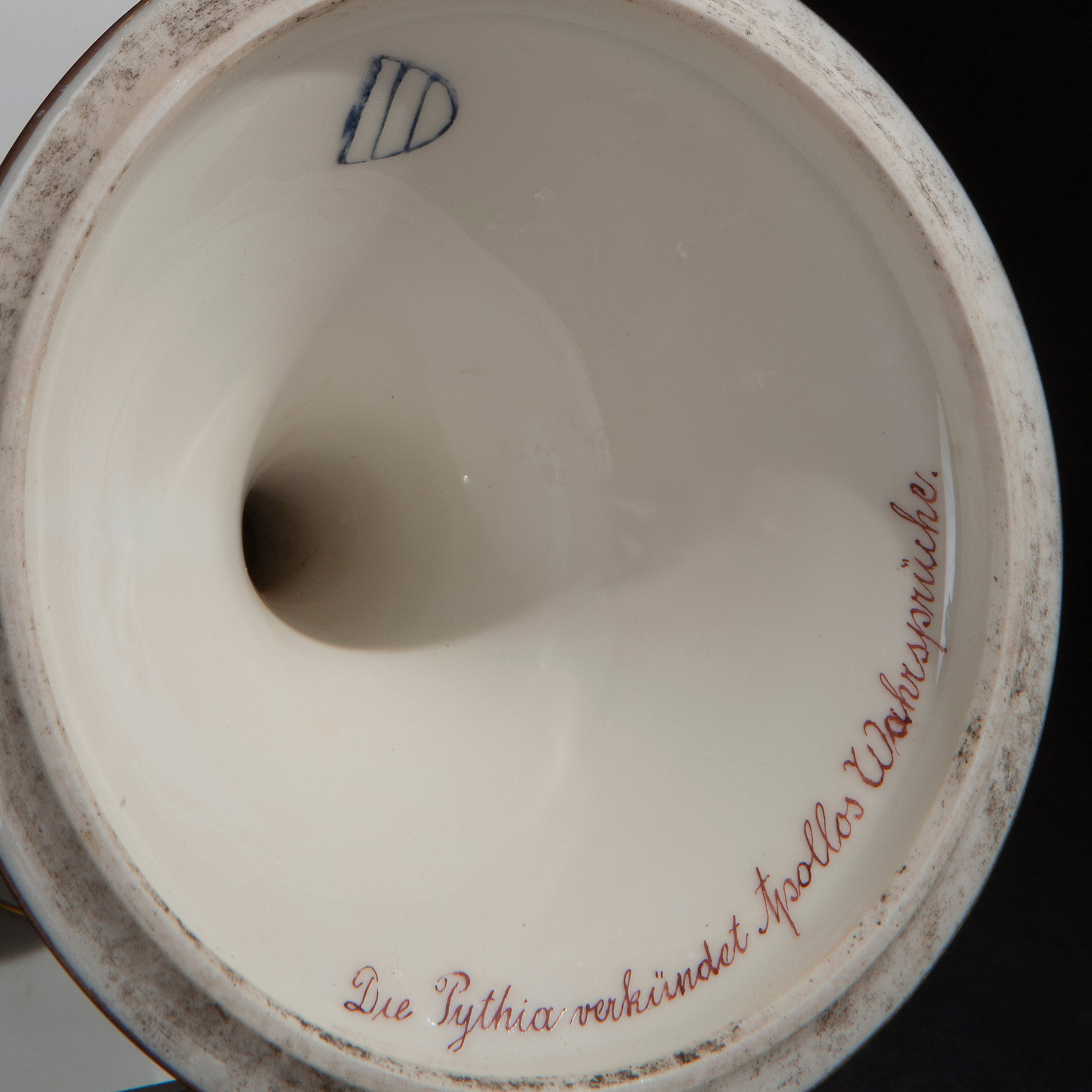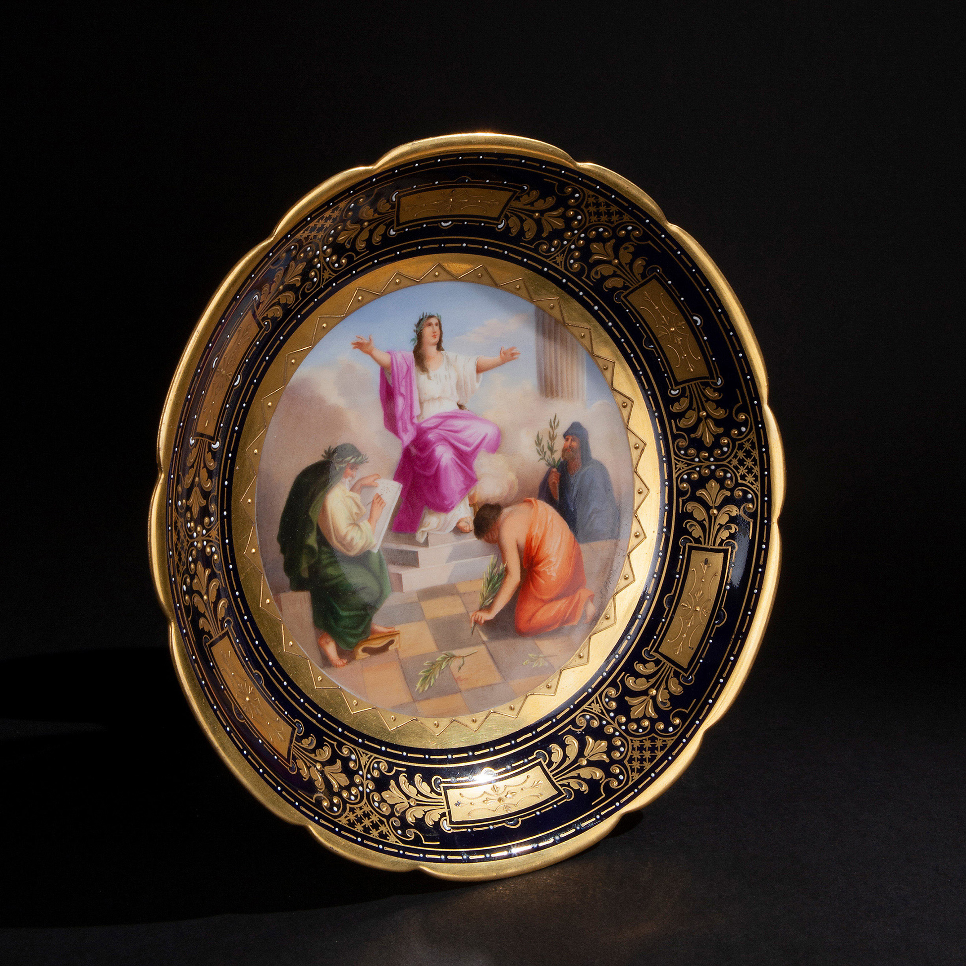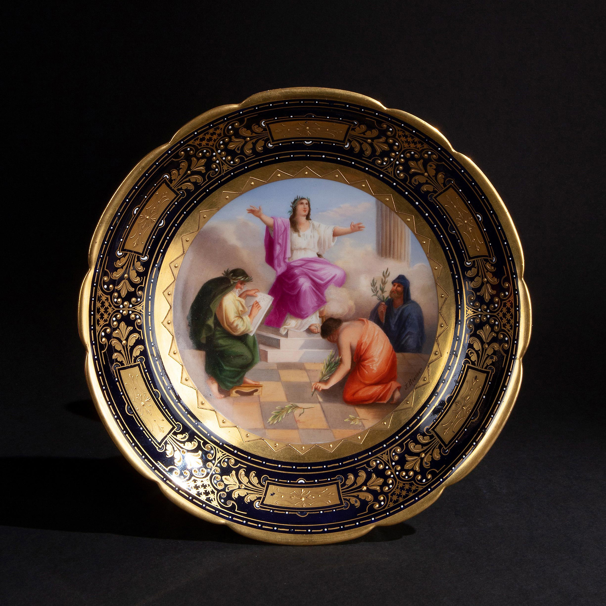 Tazza in porcellana policroma, Vienna 1900 circa Scena raffigurante l'Allegoria della Poesia, dipinto firmato J. Riemer Dimensioni 13,5x23x23 cm.