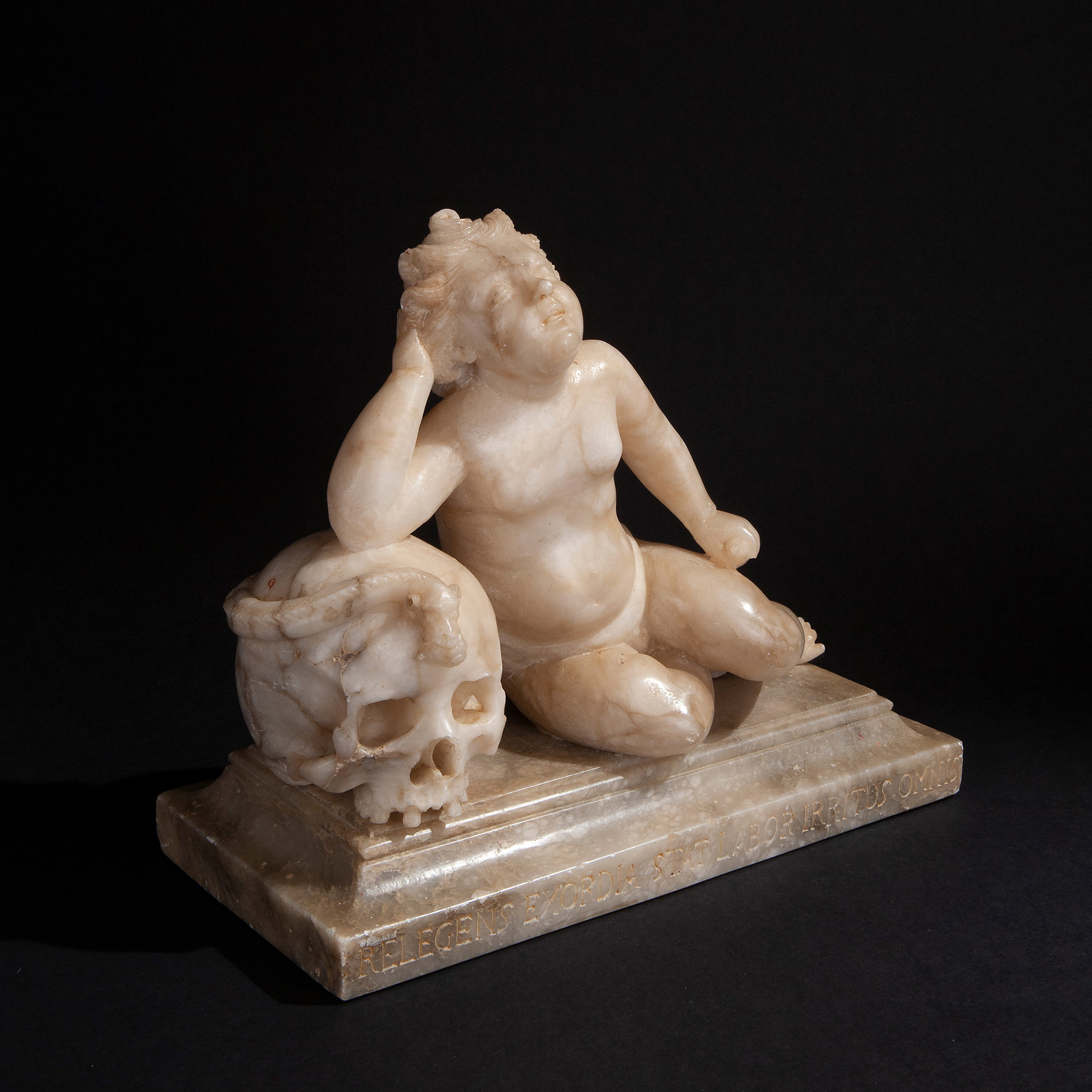 Splendida scultura in alabstro raffigurante un memento Mori, Italia centrale XVII secolo