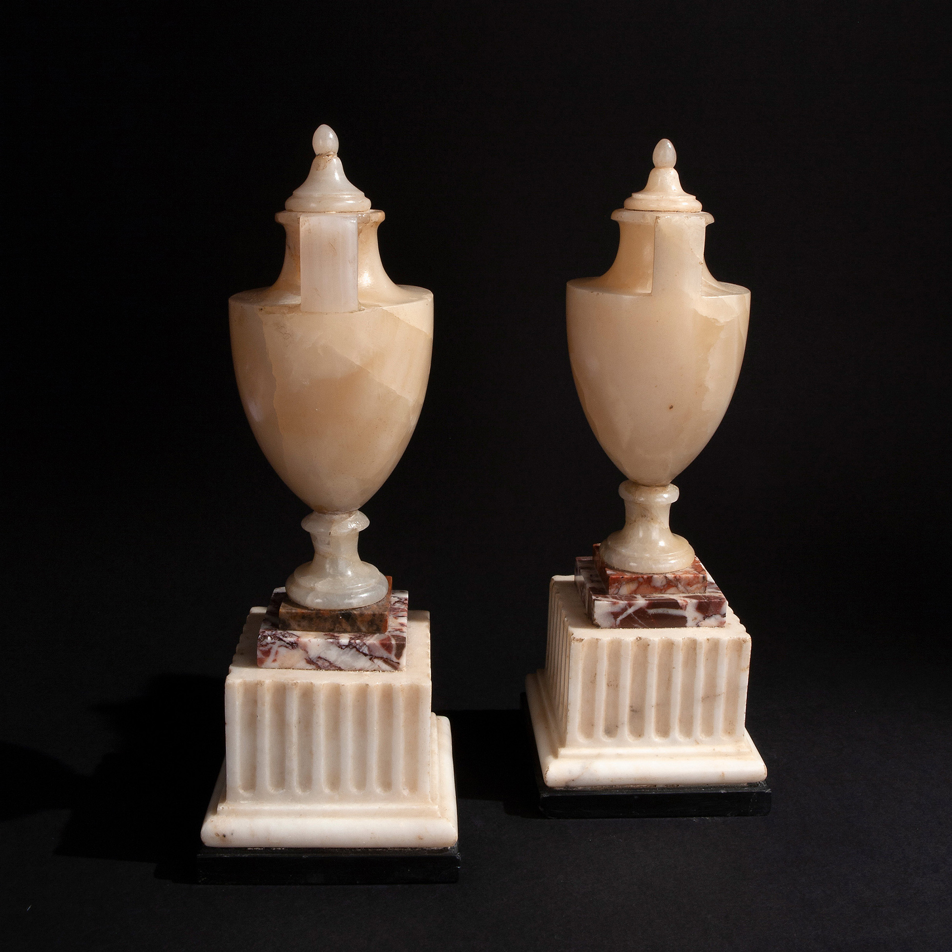 Coppia di vasi con coperchio in alabastro, Italia XIX secolo La base è in marmo bianco di Carrara a scanalature e marmi colorati Dimensioni 27x9,5x9,5 cm.