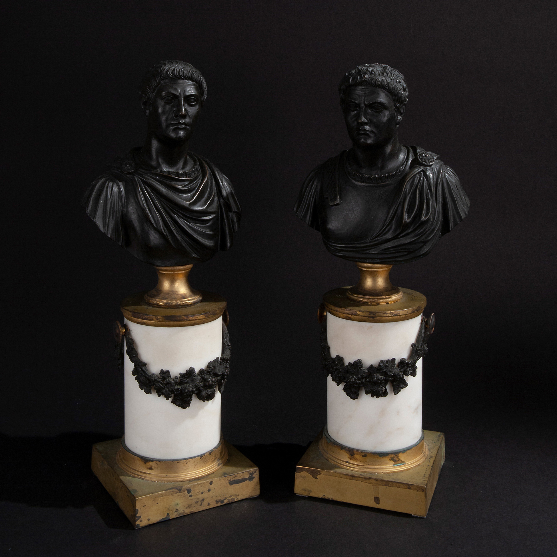Coppia di busti in bronzo brunito, Italia XIX secolo Busti raffiguranti due imperatori romani, basi in marmo bianco e bronzo dorato Dimensioni 33x14x10 cm. cad.
