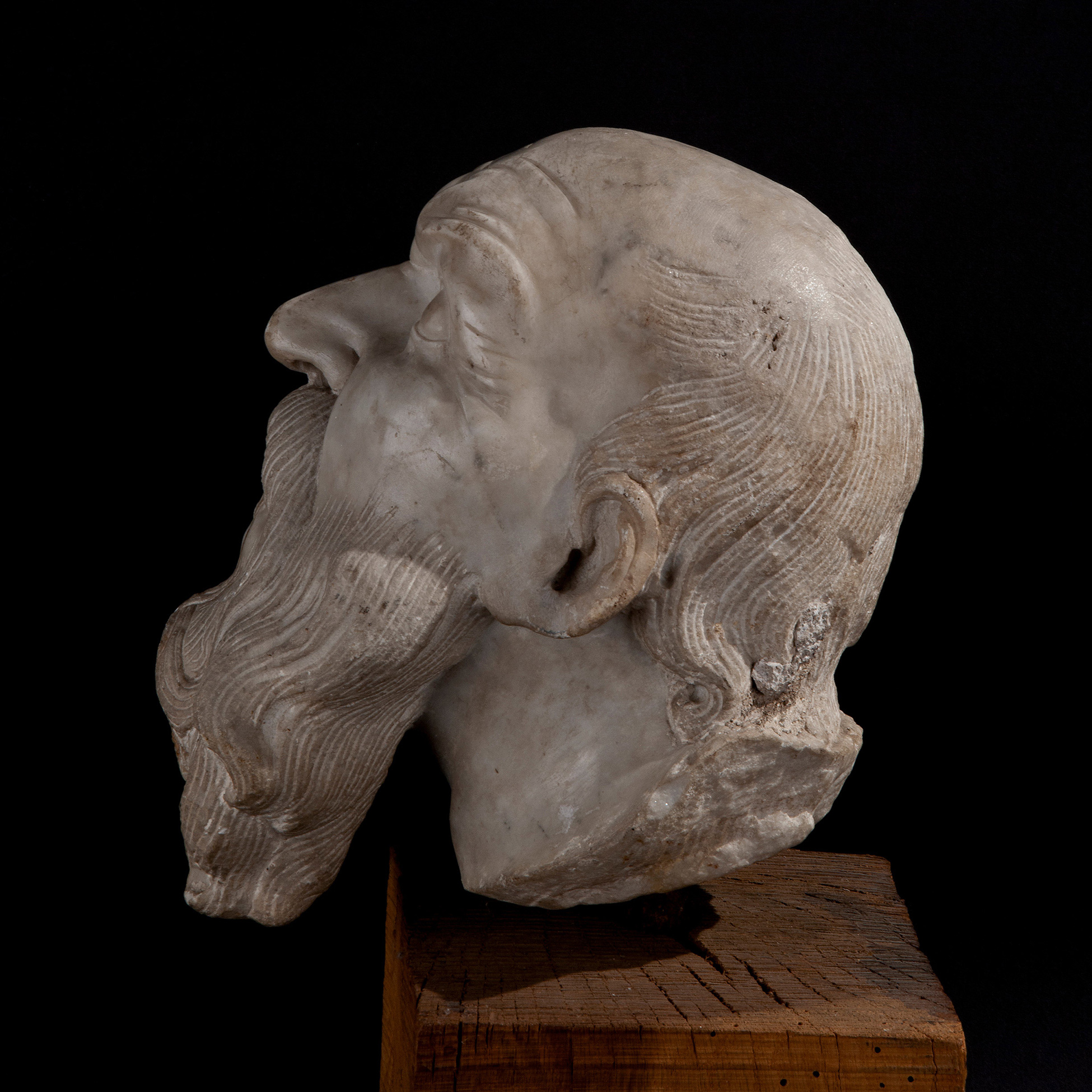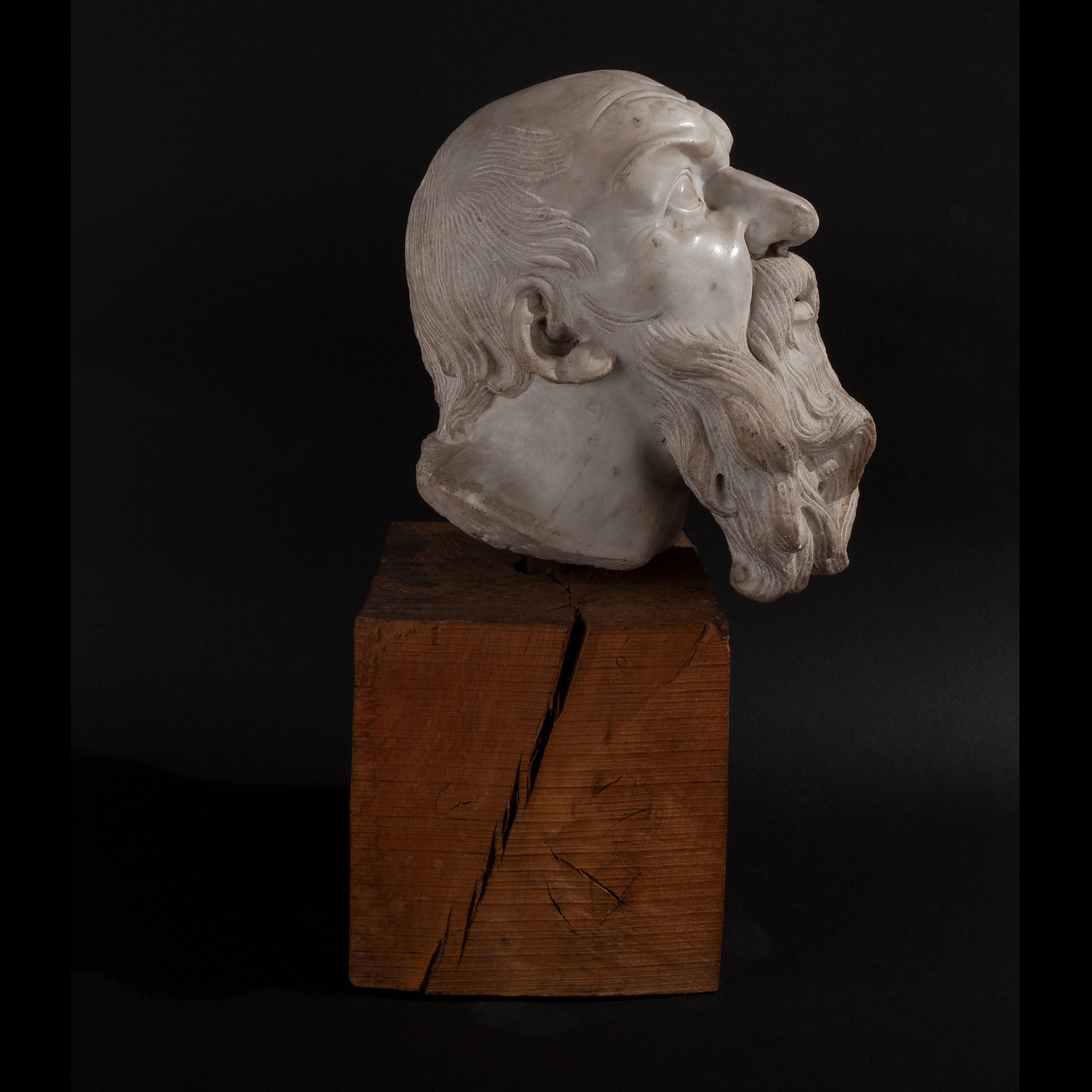 Scultura raffigurante testa di Profeta o Filosofo, Toscana XVI secolo Manufatta in marmo bianco di Carrara Dimensioni complessive cm. 50x20x26
