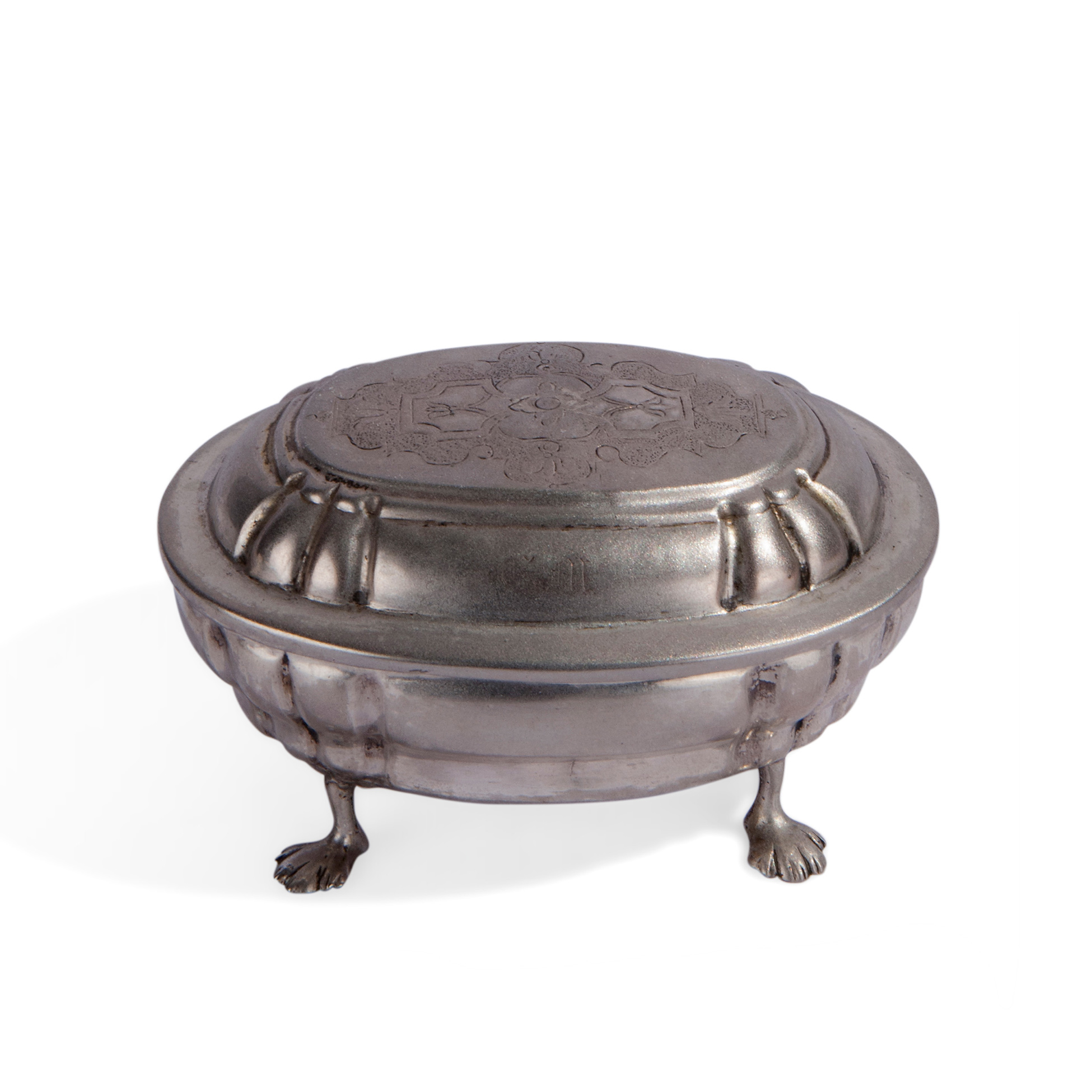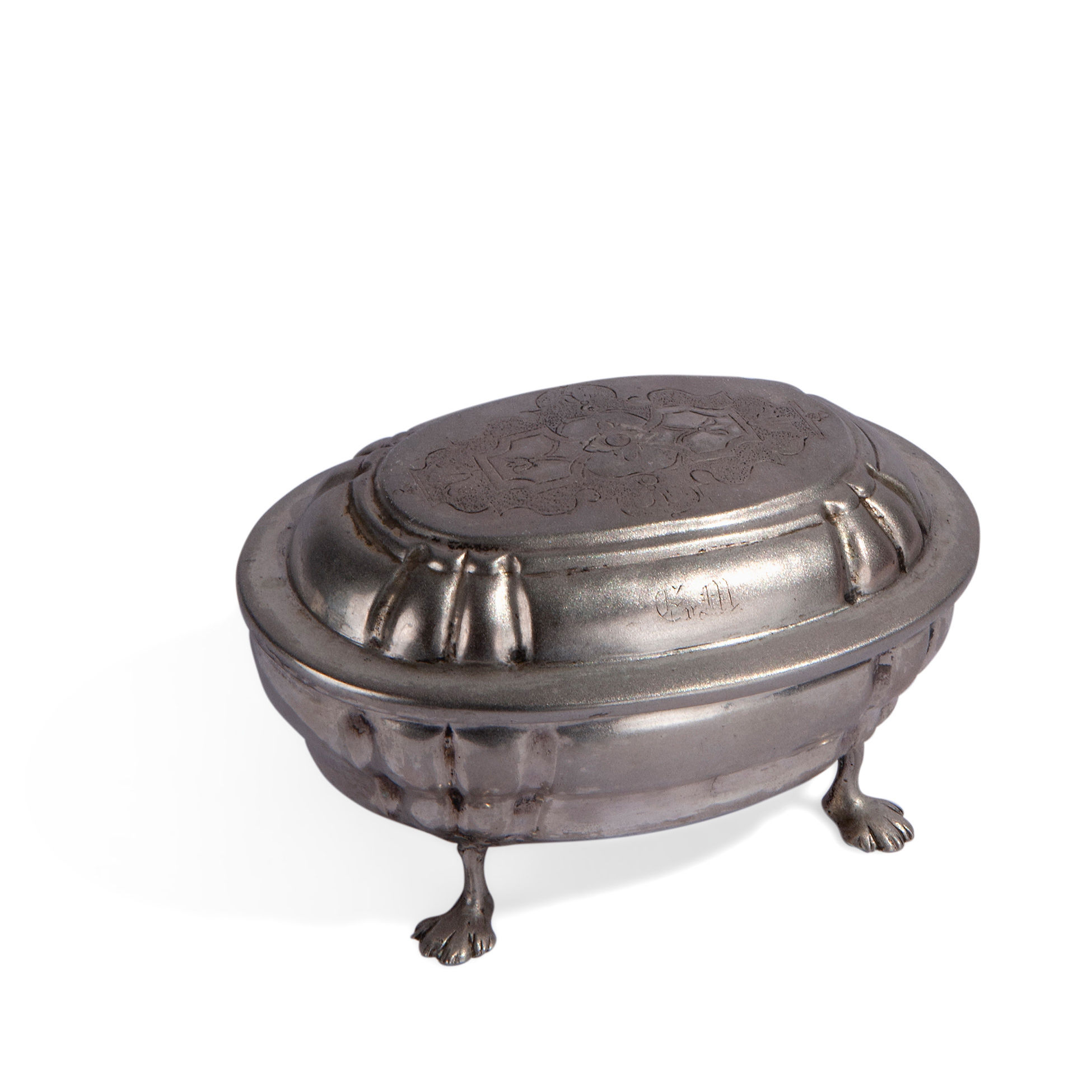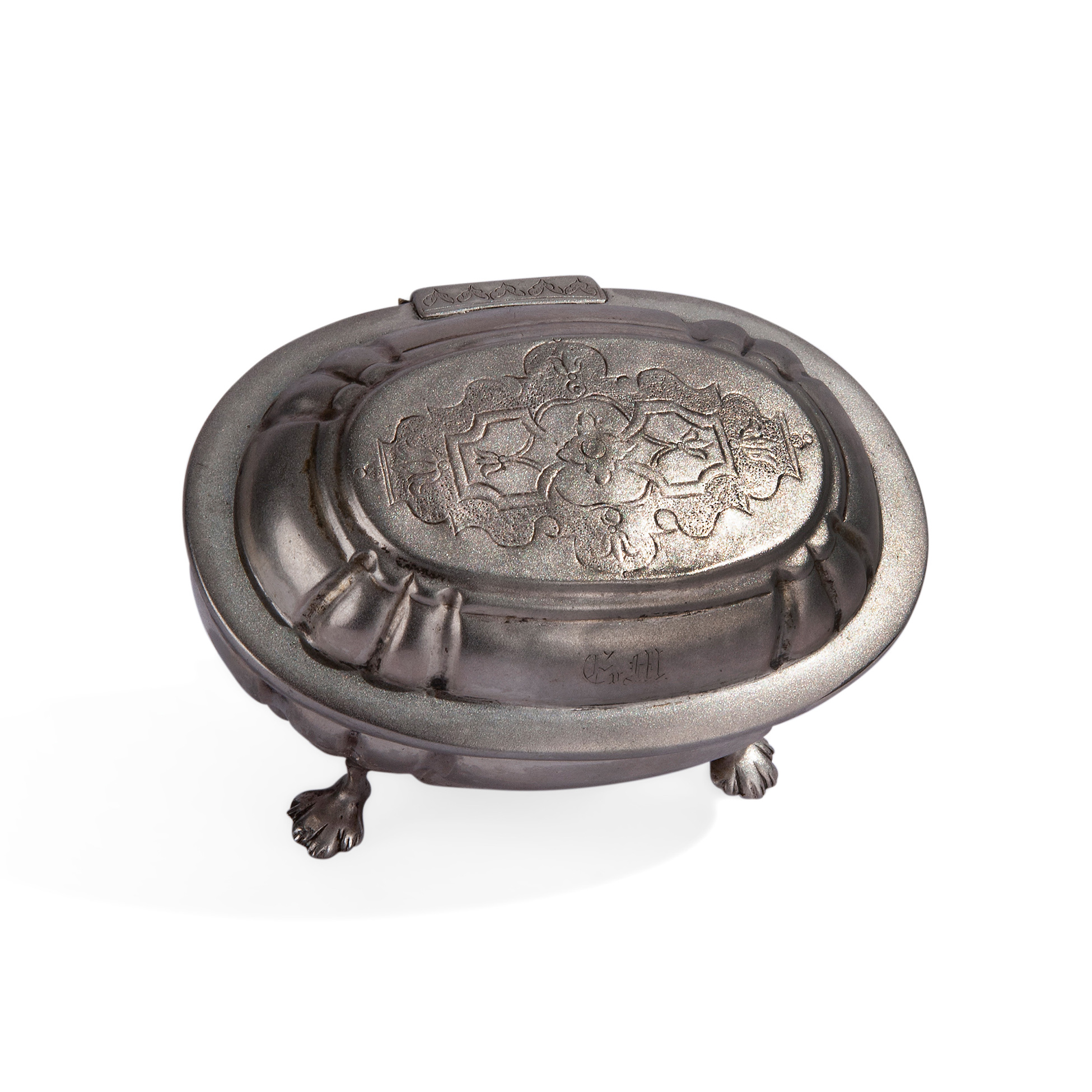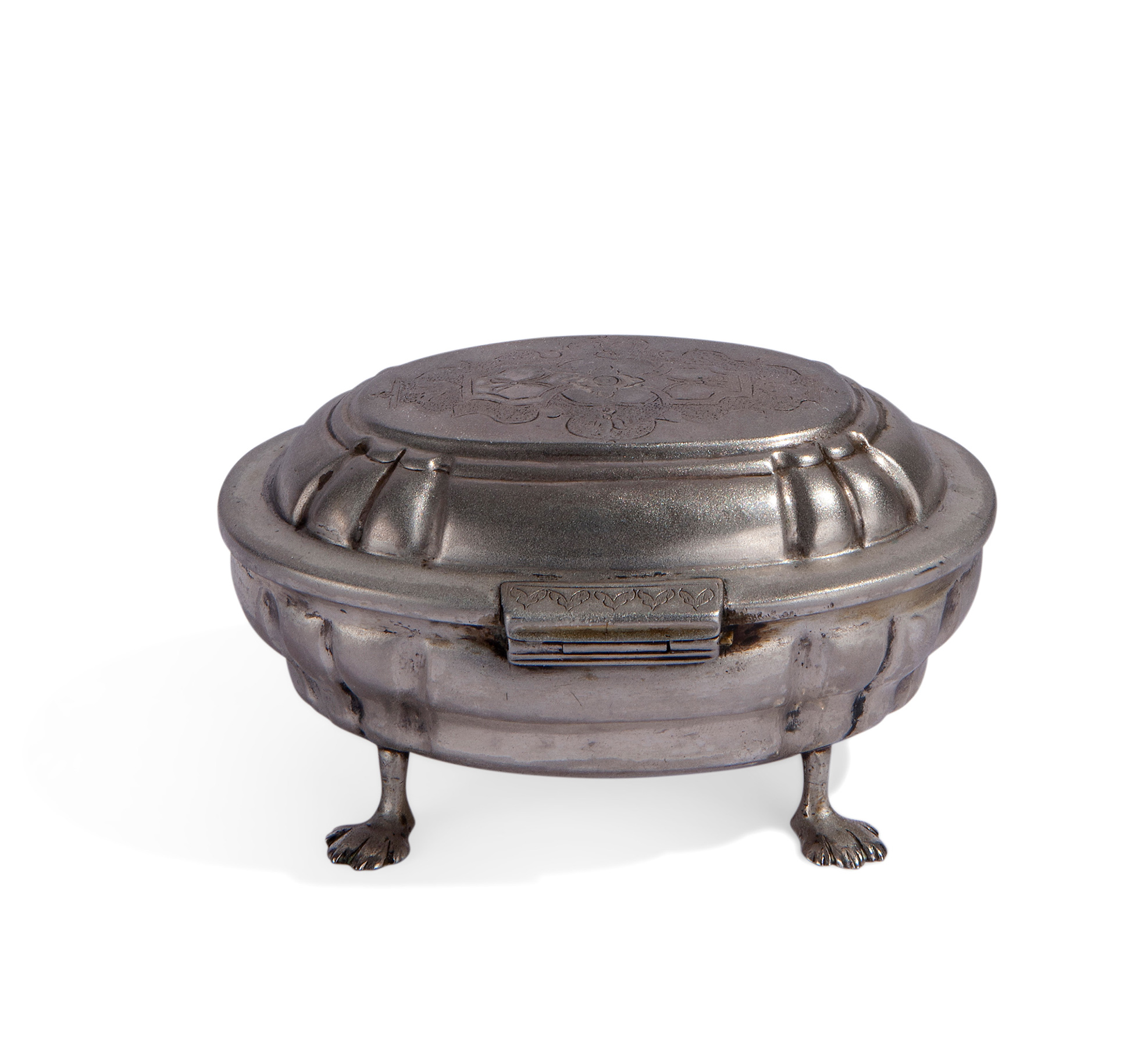 Zuccheriera in argento sbalzato e inciso, Germania XVIII secolo Reca il marchio di un maestro orefice repertoriato ma non identificato Peso complessivo gr. 169, dimensioni 7x13x9,5 cm.