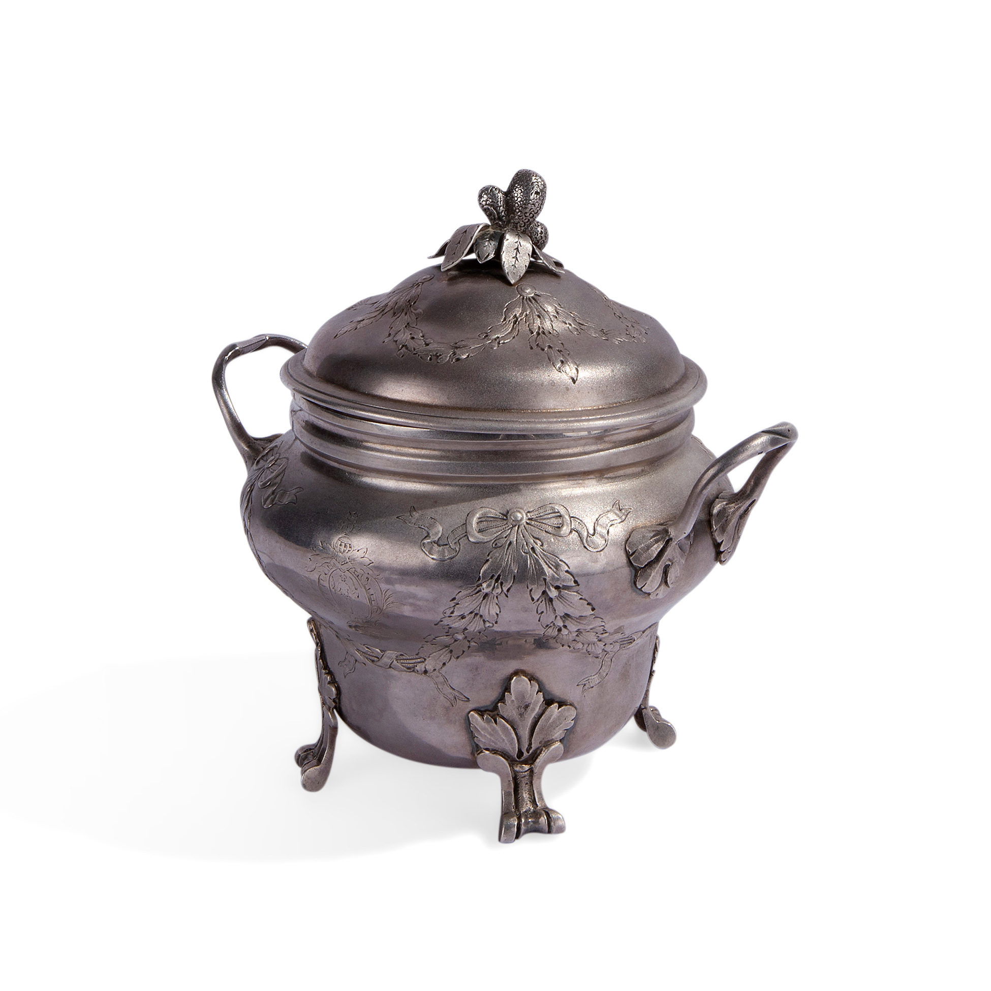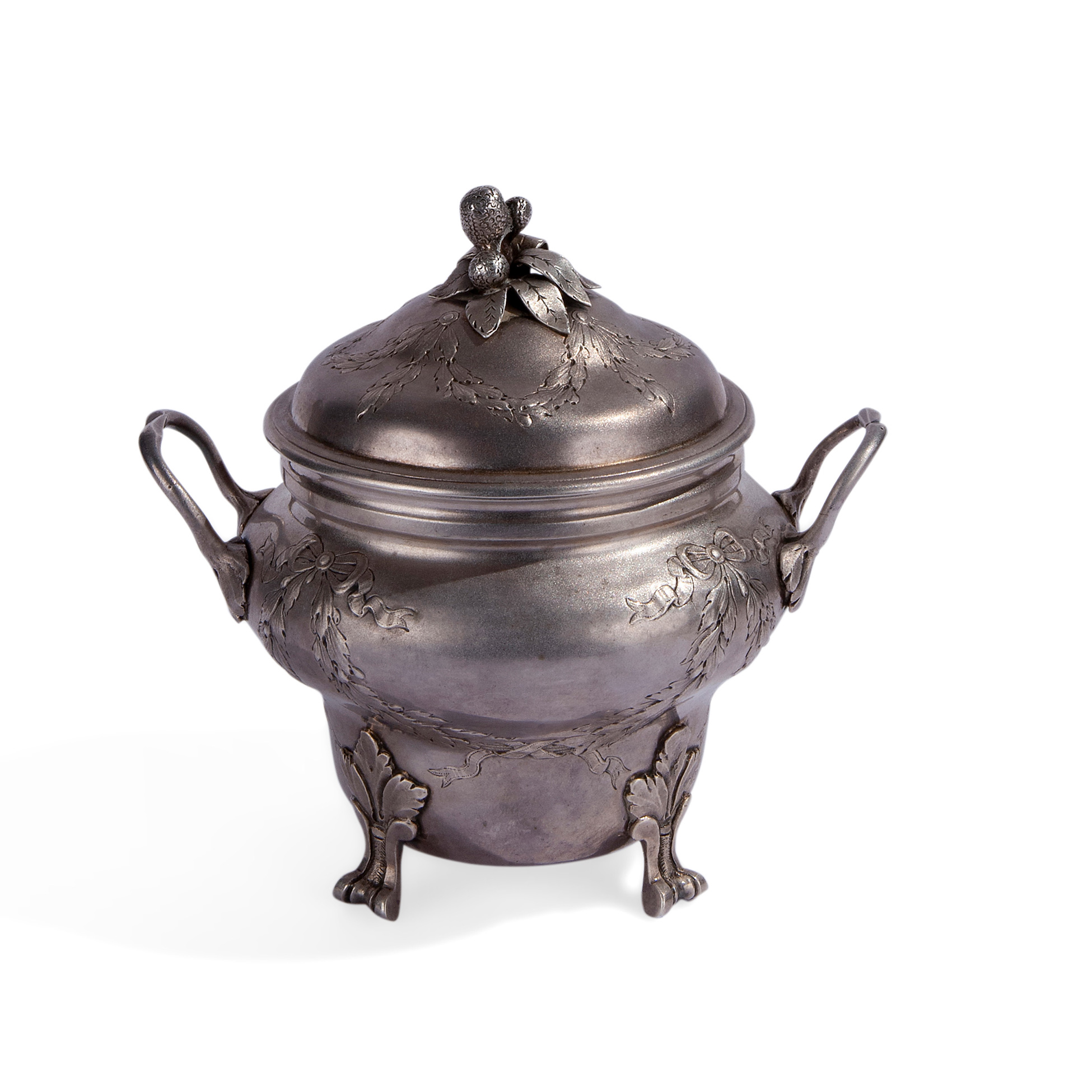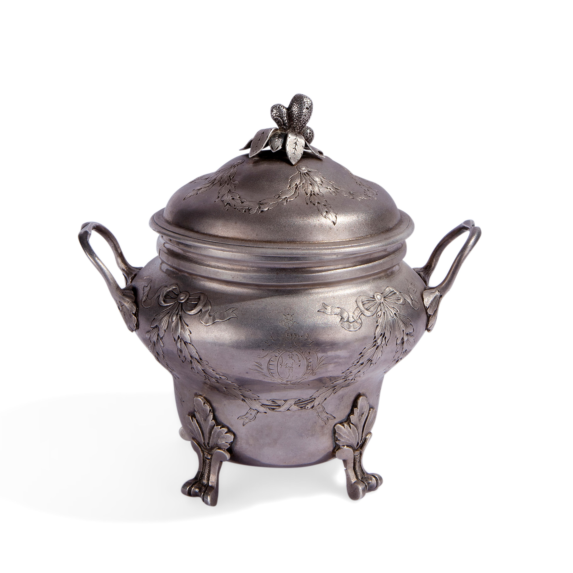 Zuccheriera in argento sbalzato e cesellato, Francia fine del XVIII secolo Reca stemma nobiliare della famiglia Sauvageot e Bollo della città di Marsiglia per l'anno 1789 (nuovo punzone in uso dal 1785), orefice G. Teissere Peso complessivo gr. 411,