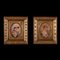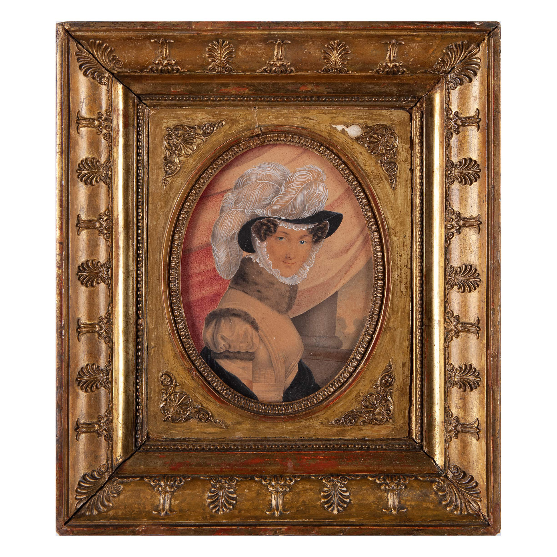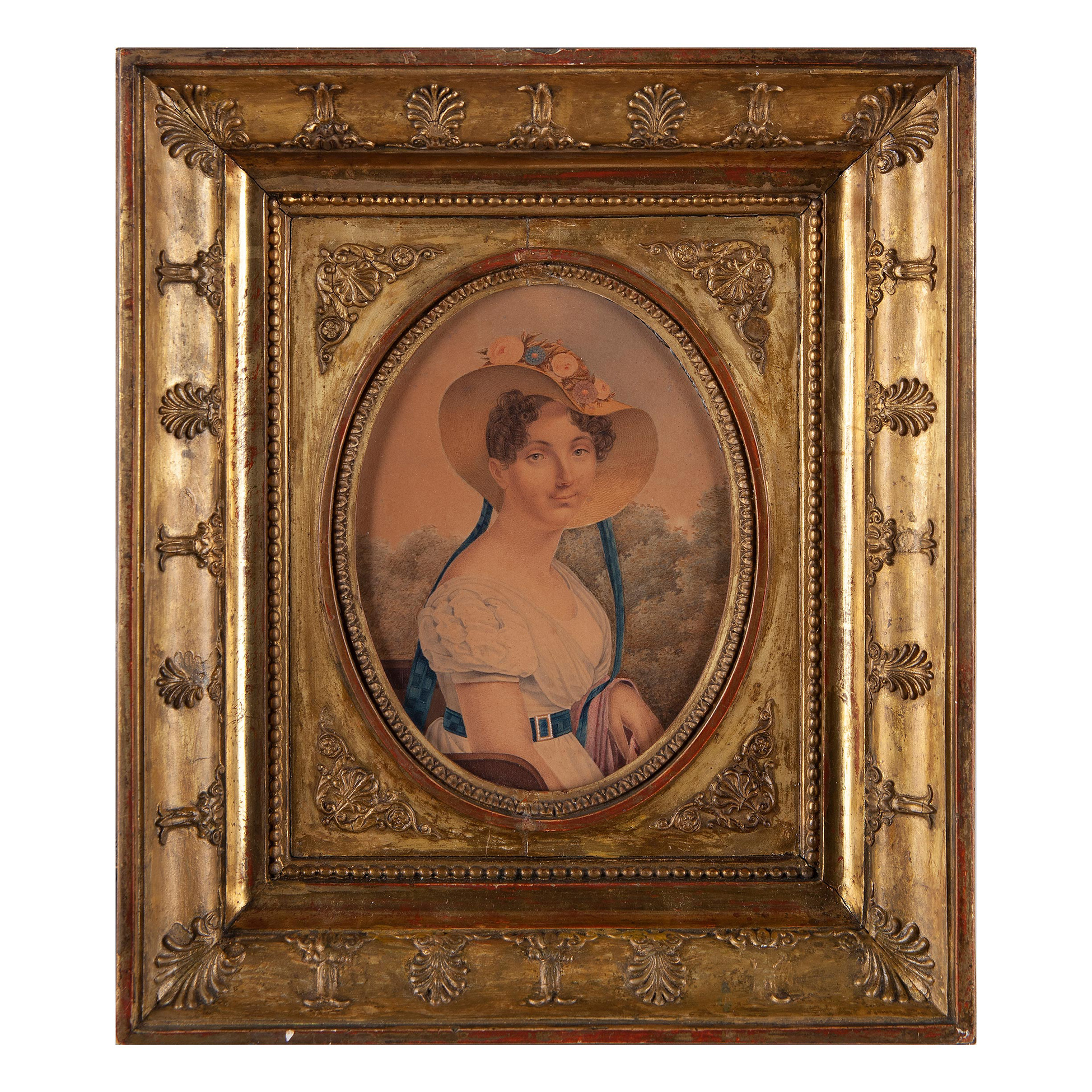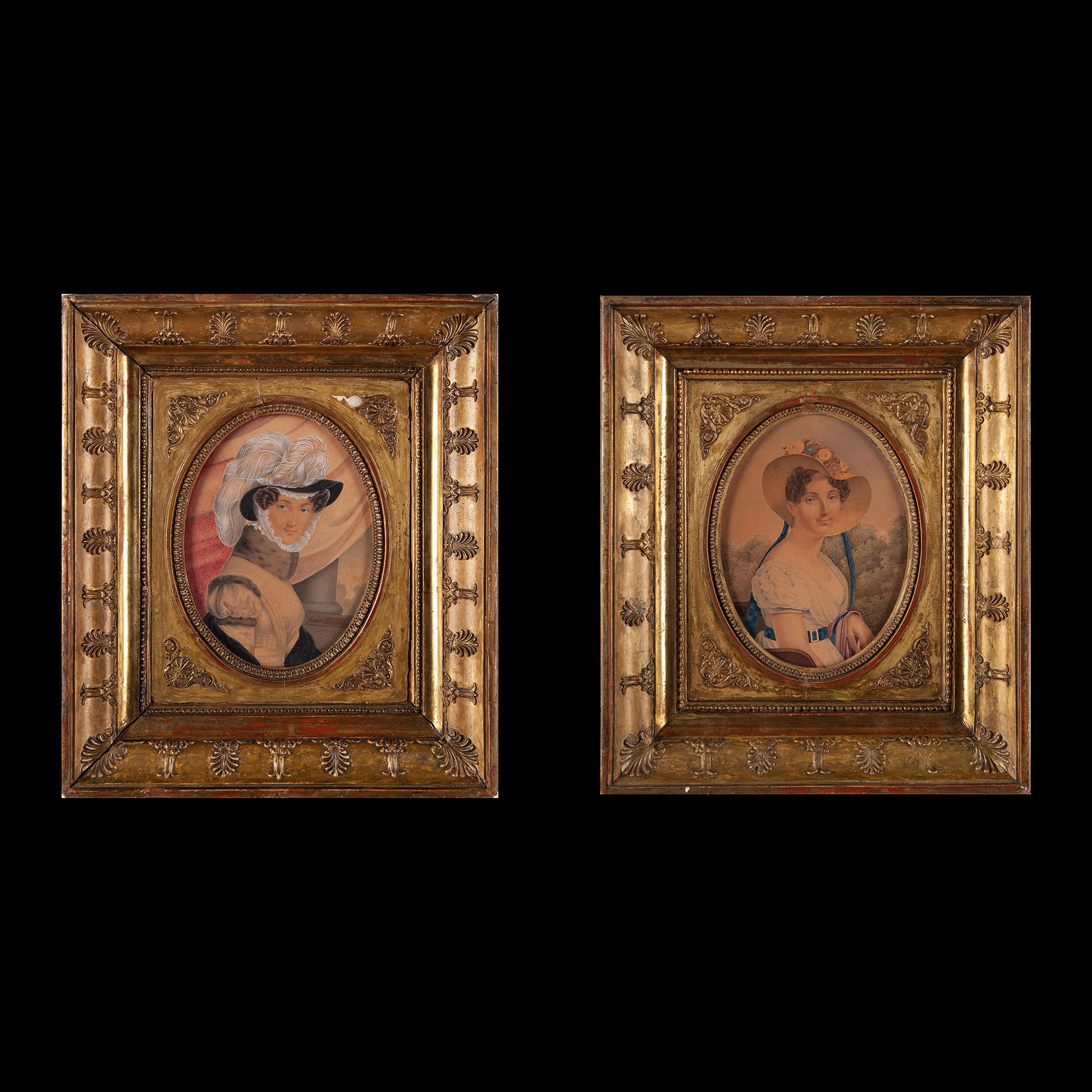 Coppie di miniature raffiguranti nobildonne con cappello, probabile scuola francese della prima metà del XIX secolo Una delle miniature reca firma illeggibile e la data 1824; belle cornice coeve in legno dorato Dimensioni ext. 26x22, int. 14x10 cm. ca