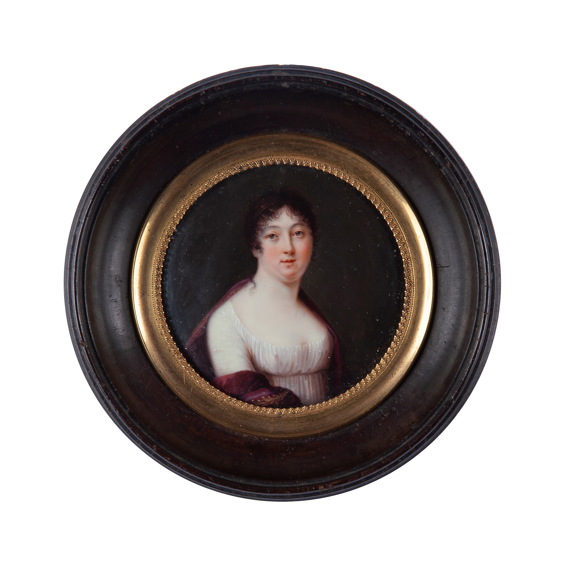 Miniatura con ritratto femminile, Francia prima metà XIX secolo Gentildonna raffigurata in abito bianco stile Impero e scialle bordeaux Diametro ext. 10, int. 6 cm.