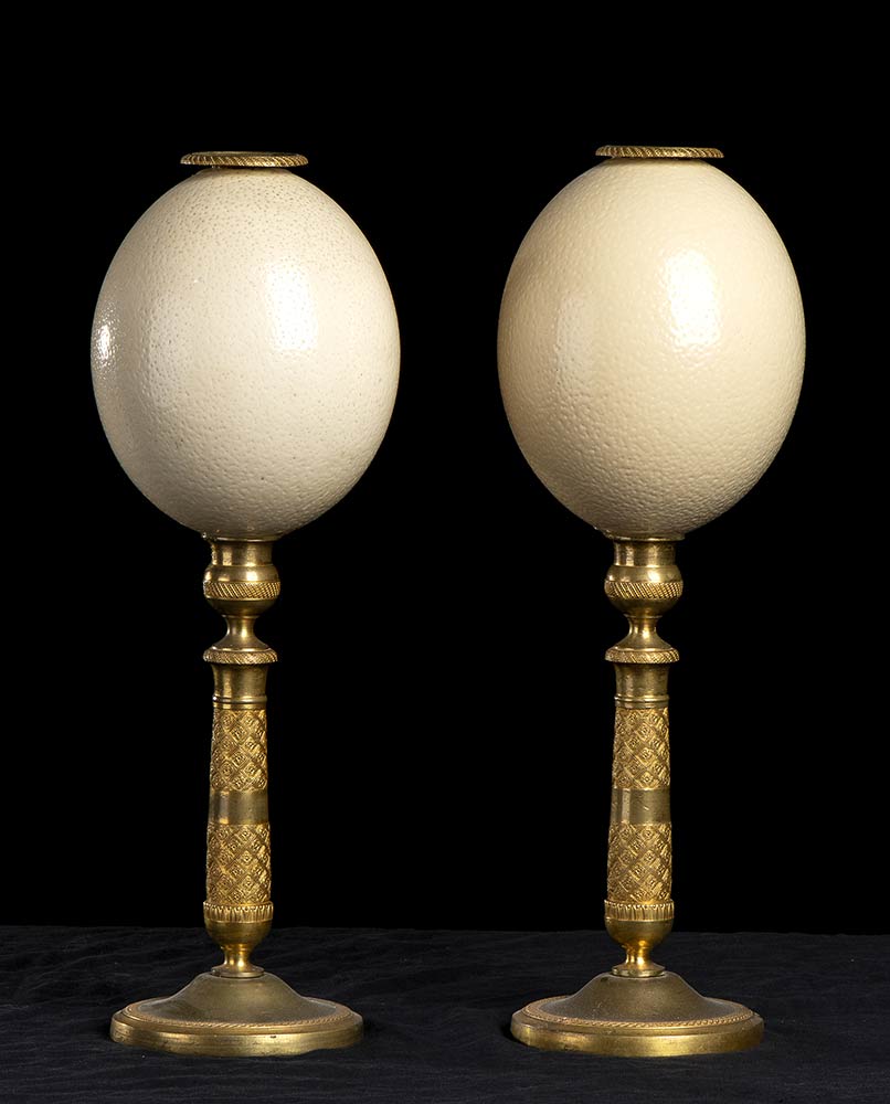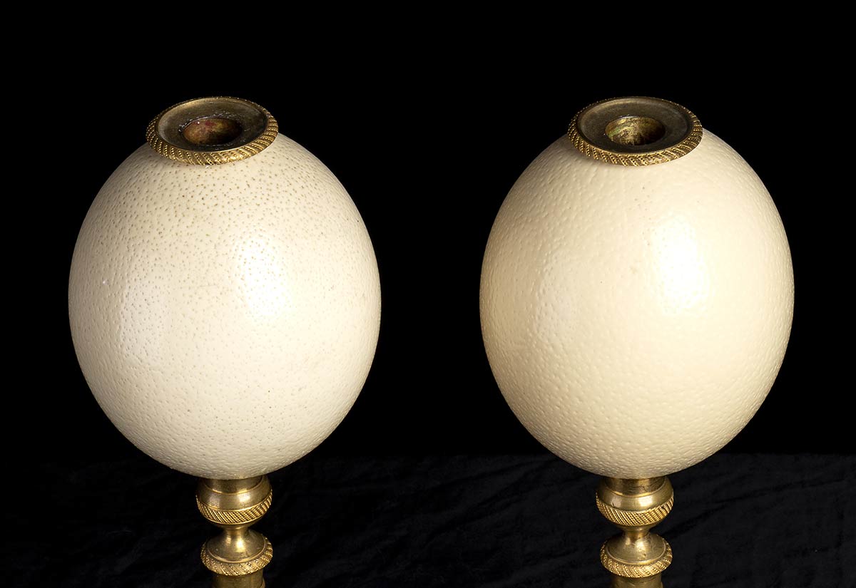 Coppia di candelabri raffinati in stile Napoleonico ricavati da due uova di struzzo, XIX Sec