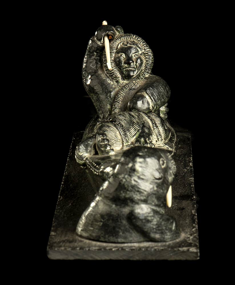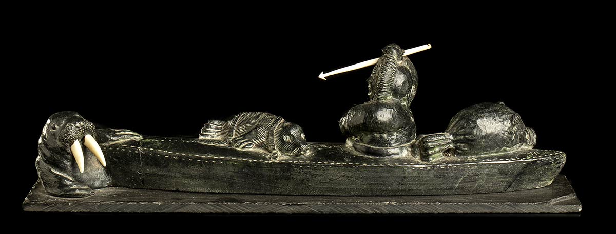 Raffinata scultura Inuit rappresentante una scena di caccia al tricheco completamete in scagliola, ad eccezione dell'arpione in osso. Inizio XX Sec. 330 mm.