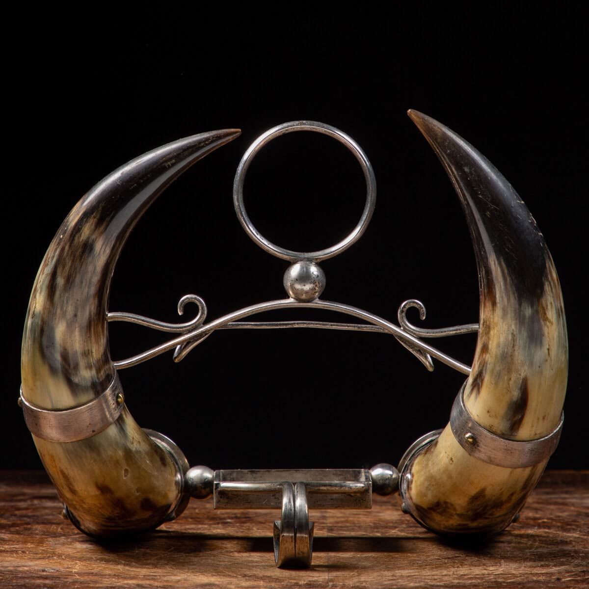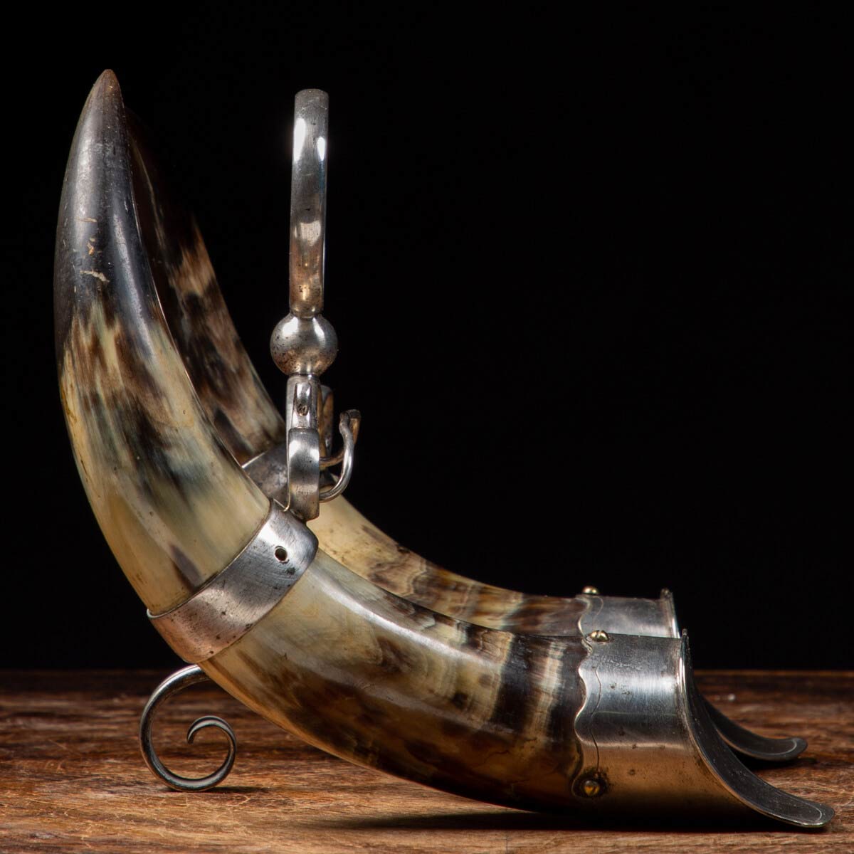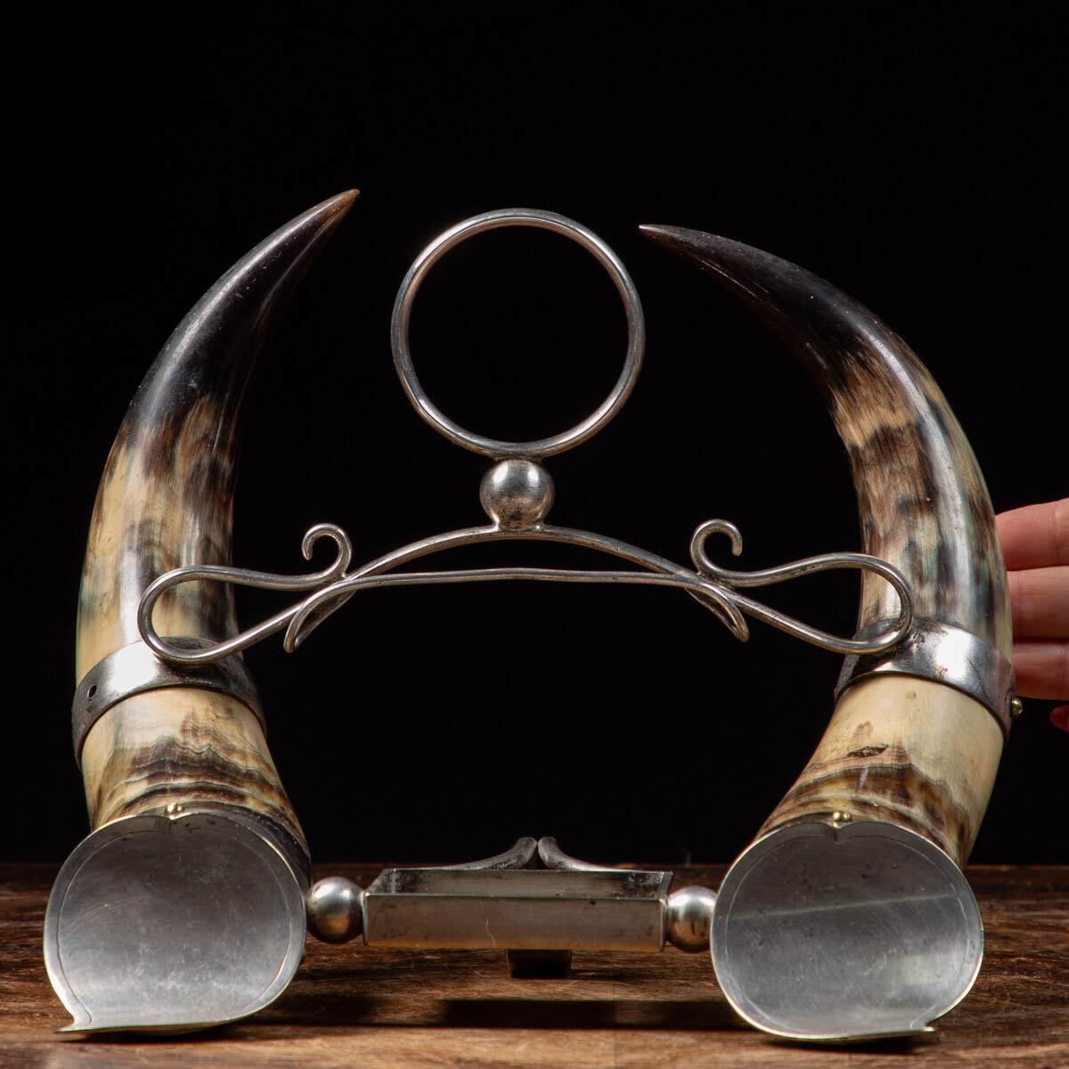 Un bellissimo e raro snuff realizzato in corno di bufalo sui quali sono stati montati elementi in metallo