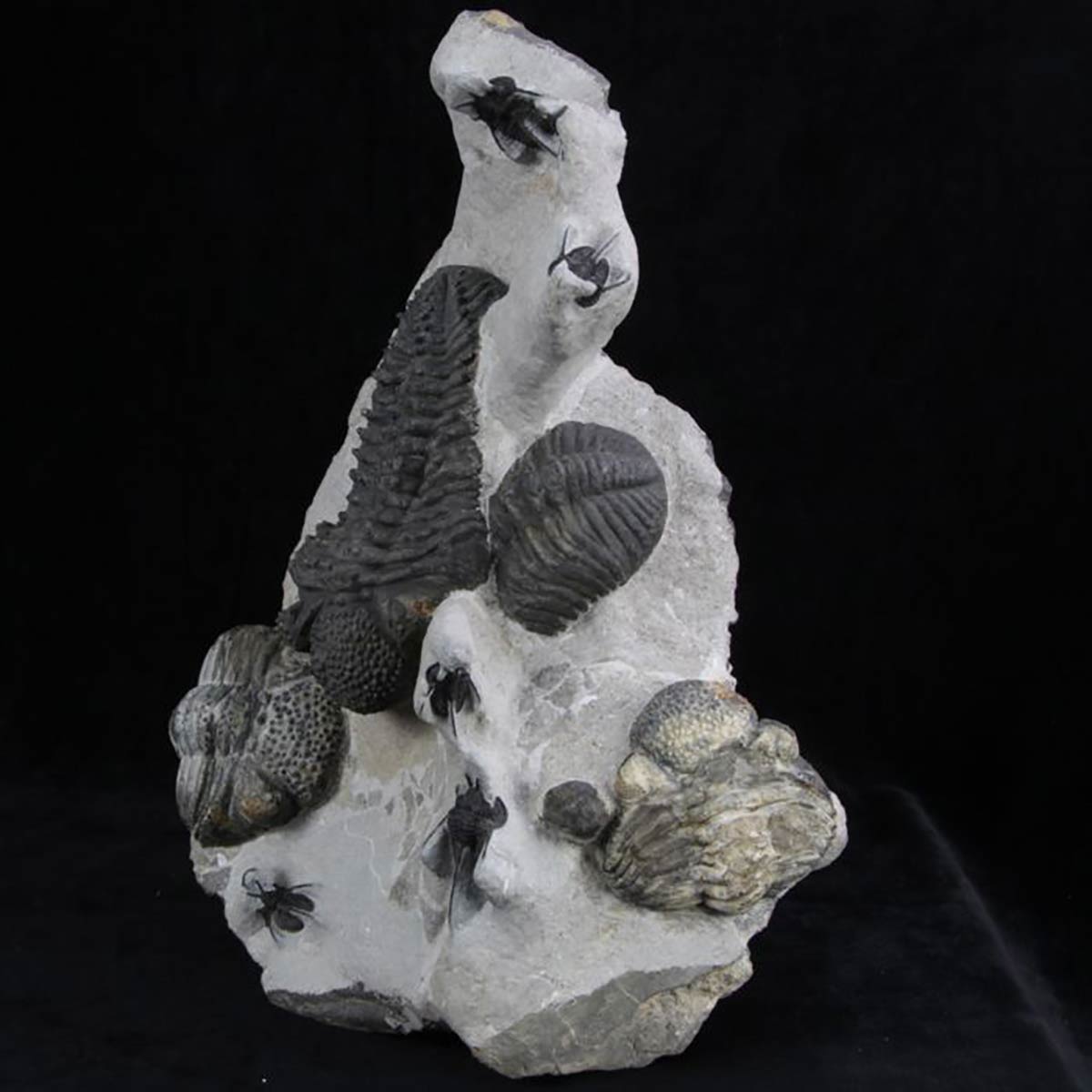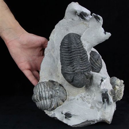 Fantastica "scultura" naturale di trilobiti risalenti al periodo Devoniano. Su questa matrice troviamo ben 10 esemplari. In bella vista abbiamo un Drotops Megalomanicus lungo 150 mm.