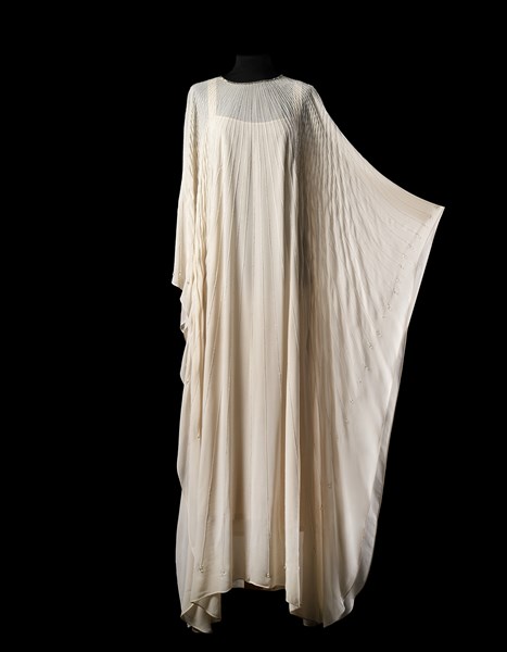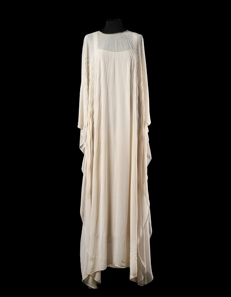 A caftan-like silk chiffon evening dress embroidered with tube-beads to form a radial pattern, the neckline embroidered with rhinestones, a silk sheath underdress completes the outfit (tg. 44/46) (defects and losses)