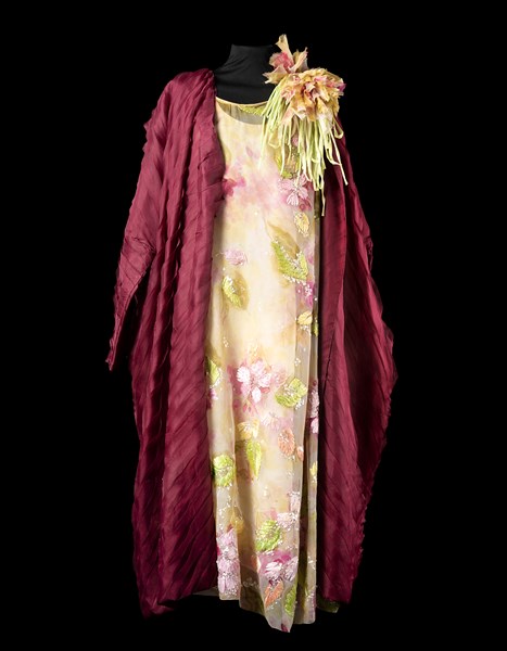 Lotto composto da un soprabito con maniche a pipistrello in organza a lamelle sovrapposte color bordeaux e un abito Christian Dior in chiffon a fiori nei toni del verde e bordeaux con applicazioni a rilievo in rafia e paillettes, grande fiore in tessuto sulla spalla, unito ad una borsetta in taffetas con chiusura in metallo lavorato a giorno (tg. 44/46) (difetti e segni d'uso)