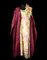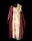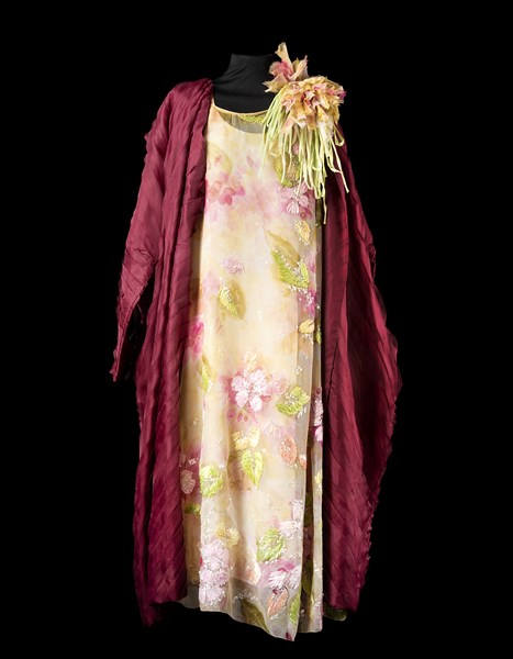 Lot composed of a burgundy organdie batwing overcoat made of overlapping segments and a Christian Dior floral chiffon dress embroidered with raffia and sequins and with a large flower applied to the left shoulder, appended a taffeta silk evening pouch with an openwork metal clasp (tg. 44/46) (defects, wear)