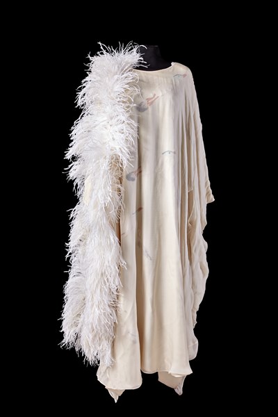 Vestito con maniche a pipistrello in chiffon con sottovestito in seta ricamata con "gabbiani in volo" unito ad un boa color avorio (tg. 44/46) (difetti e segni d'uso)