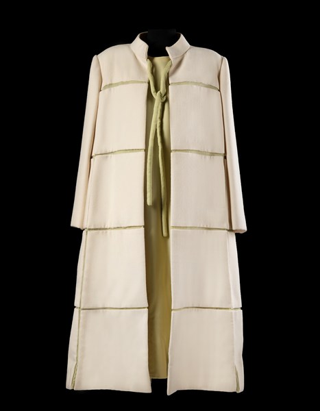 Lotto composto da abito in georgette di seta verde pallido con maniche a pipistrello e un cappotto con collo alla coreana in double color panna montato a scacchi su fondo di seta verde pallido come l'abito (tg. 46/48) (difetti e segni d'uso)
