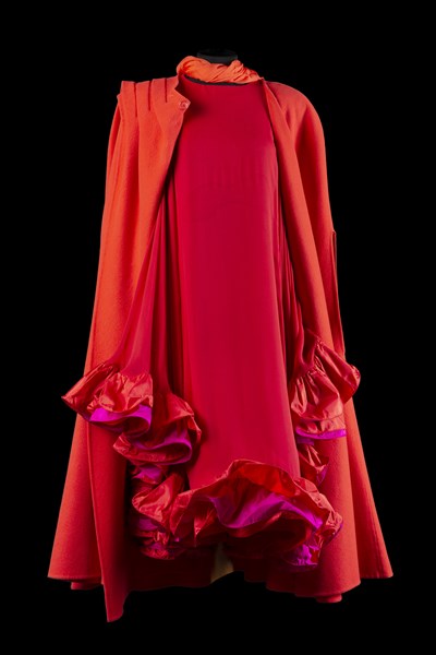 Lot comprising a batwing red silk georgette cocktail dress with large ruches in red and fuchsia and a coral red woolen overcoat (tg. 44/46) (defects, wear)