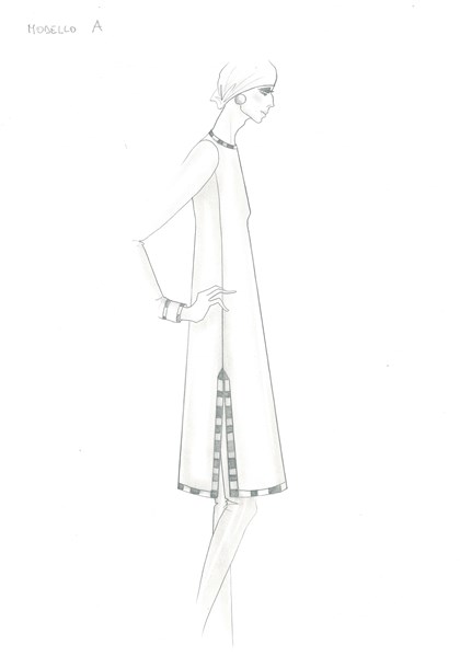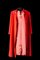 Lot comprising a woolen coral overcoat and a silk tunic dress rimmed with a plissé taffeta in various shades of orange, red and pink, and a fascinator en suite. This lot is accompanied by a preparatory sketch of the dress (tg. 44/46) (defects, wear)
