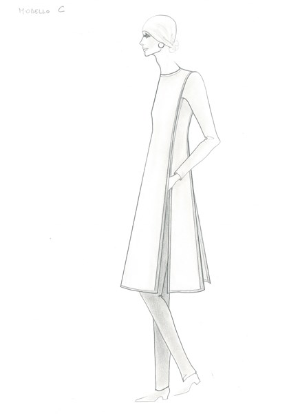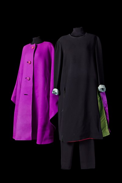Completo in crępe di seta composto da pantalone a sigaretta, tunica a quattro teli con ampi spacchi foderati in taffetas verde e fucsia, unito a un particolare cappotto in panno di lana fucsia e nero, bottoni logati. Il lotto č accompagnato dal bozzetto preparatorio per la realizzazione del completo casacca e pantalone (tg. 44/46) (difetti e segni d'uso)