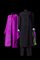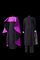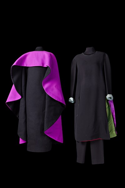 A black silk crępe trouser suit composed of a tunic with four ample slits lined with fuchsia, green and red silk and a particular woolen coat in fuchsia and black with logoed buttons, the lot includes a preparatory sketch by the Designer for the tunic and trouser outfit (tg. 44/46) (defects, wear)