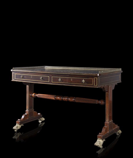 Scrittoio da centro lastronato e filettato in ottone con fronte a due cassetti. Montanti squadrati riuniti da traversa terminanti con scarpette in bronzo munite di rotelle. Piano in pelle impressa in oro decorato da ghiera traforata. Francia, secolo XIX (cm 114x76x66) (difetti)