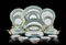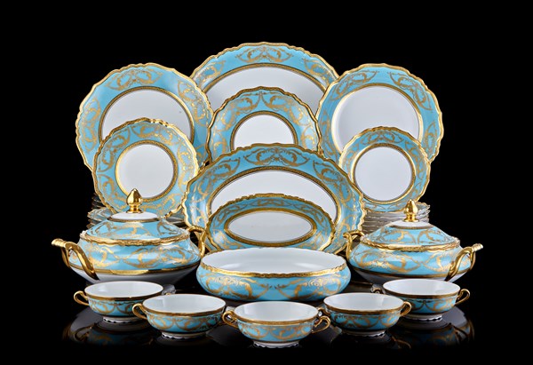Manifattura di Limoges. Parte di servizio Jammet Seignolles in porcellana con bordura turchese decorata a fregi dorati composto da: diciannove piatti piani, nove piatti fondi, dodici piatti piccoli, sei tazze da brodo, due zuppiere di diverse dimensioni, sette piatti da portata di diverso uso