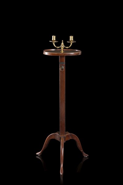 Candeliere a tavolino con pianetto ovale e portacandele sagomato. Base a colonna sfaccettata regolabile in altezza e terminante a tre piedi mossi. Francia, secolo XIX (h. cm 95) (difetti)