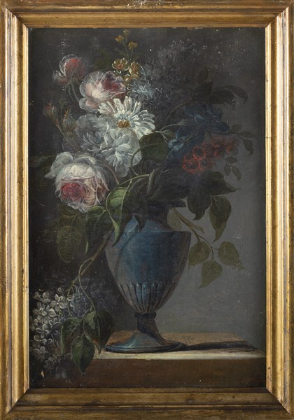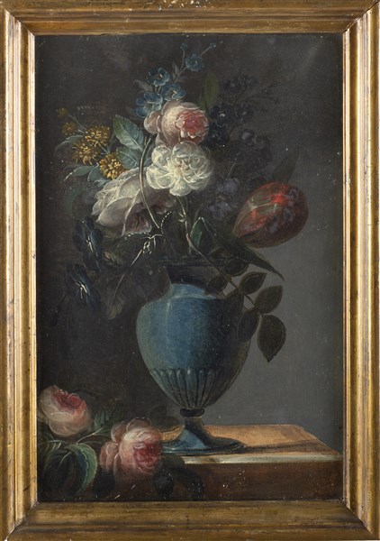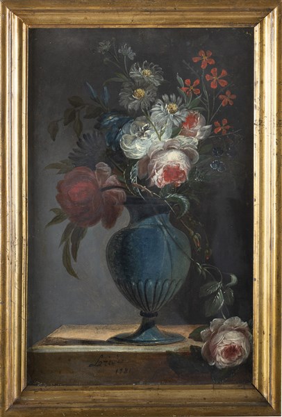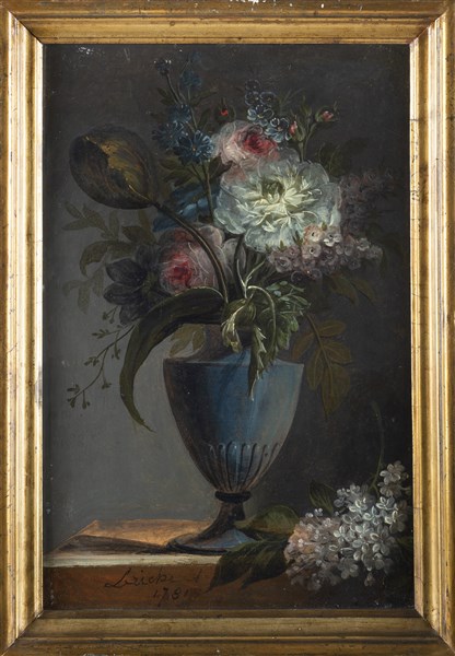 Ignoto, gruppo di quattro dipinti a olio su cartone pressato raffiguranti vasi di fiori. Due firmati e datati Le Riche 1781
