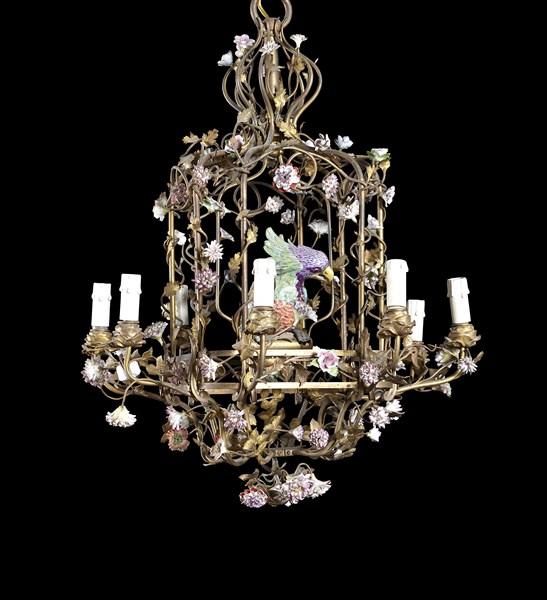 Lampadario a otto luci in metallo dorato decorato a foglie, fiori e centrato da pappagallo a tutto tondo in porcellana policroma (h. cm 70) (difetti)