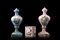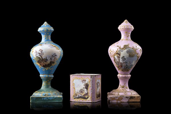 Manifattura francese, secolo XIX. Lotto composto da due elementi decorativi a forma di vasi in rame smaltato a fondo rosa e blu a paesaggi policromi (h. cm 24) (difetti e restauri); uniti a un vasetto di simil decoro (difetti)