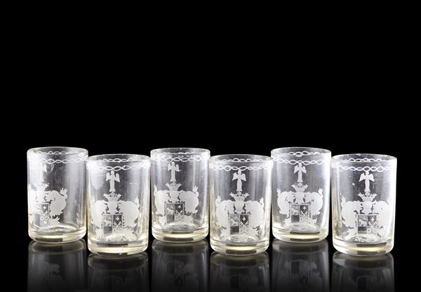 Manifattura del secolo XIX. Gruppo di sei bicchieri in vetro inciso all'acido con lo stemma della famiglia Angeli di Cloz, nobili trentini (lievi difetti)