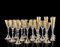 Manifattura di Murano. Gruppo di otto calici in vetro da acqua, quattro da vino e sette da champagne decorati a dorature e volute fogliate, recanti alla base lo stemma della famiglia Angeli di Cloz (lievi difetti)