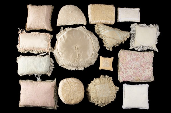 Numerosi cuscini confezionati con pizzi di diverse fogge e dimensioni (difetti)