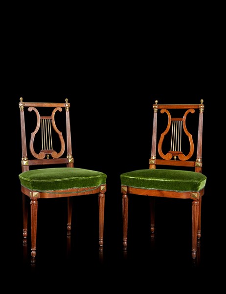 Coppia di sedie in mogano con schienale a lira. Pinnacoli, fregi e montanti decorati da applicazioni in bronzo. Seduta imbottita e rivestita in velluto. Gambe tornite e rastremate. Recante stampigliatura di Louis Magdeleine Pluvinet, Francia fine secolo XVIII