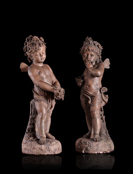 "Allegorical winged figures" pair of terracotta sculptures. Signed at the base (h. cm 60) (defects and restorations)