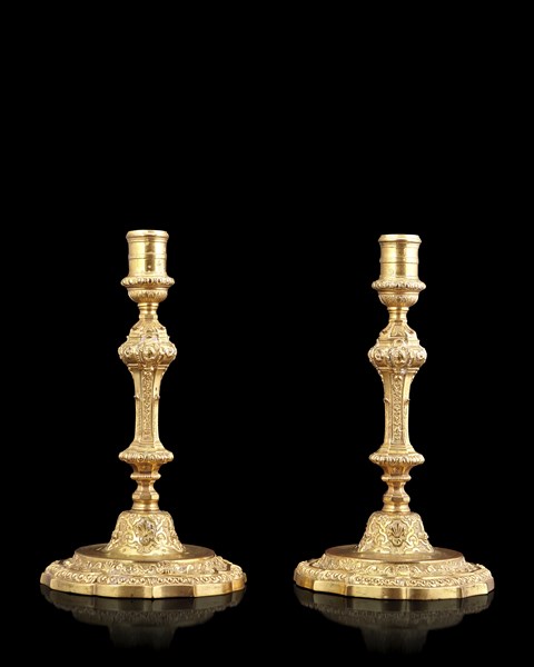 Coppia di candelieri in bronzo dorato con fusti a colonna sfaccettata e cesella
