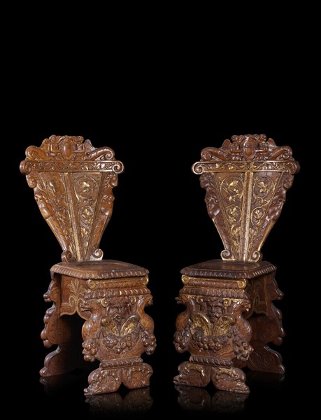 Coppia di antichi sgabelli in noce intagliato e parzialmente dorato con schienale decorato nella cimasa a figure fantastiche che sorreggono stemma. Gambe ad asso di coppe scolpite a mascheroni, ghirlande di frutta e delfini (difetti e restauri)