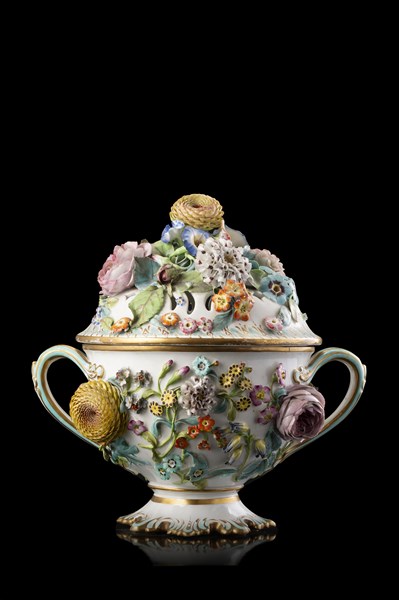 Manifattura del secolo XIX. Zuppiera biansata con coperchio in porcellana decorata in policromia a fiori in rilievo (cm 25x30x20) (lievi difetti)