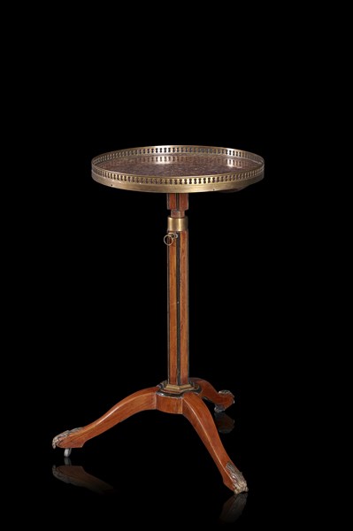 Tavolino con piano di forma circolare in marmo decorato da ringhiera traforata, regolabile in altezza. Colonna esagonale terminante a tre piedi sagomati muniti di rotelle e decorati con applicazioni in bronzo. Secolo XIX (h. cm 73; d. cm 41,5)