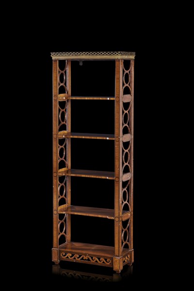 Piccolo étagčre lastronato in mogano e palissandro a sei ripiani con ringhiera in ottone traforato. Fascia intagliata a motivo stilizzato (cm 38x105x16) (difetti e mancanze)