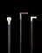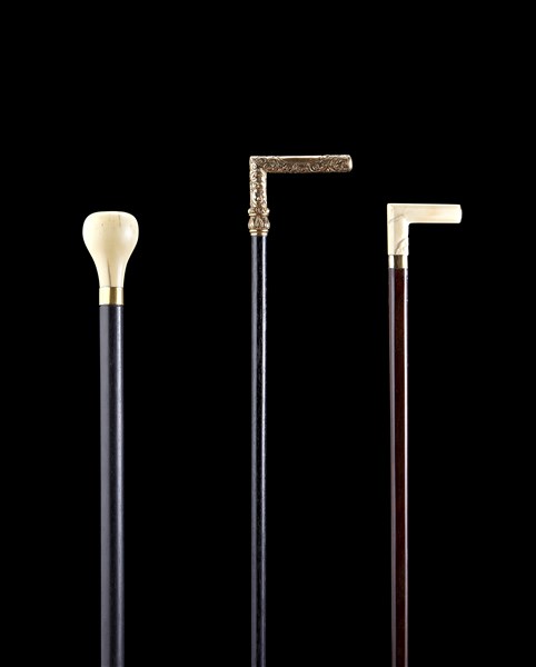 Lotto composto da tre bastoni da passeggio con canne in legno, prese e ghiere in avorio e oro. Secolo XIX (difetti)