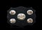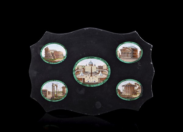 Fermacarte in lavagna con micromosaici raffiguranti vedute romane entro cornici in malachite (cm 18x13) (lievi difetti)