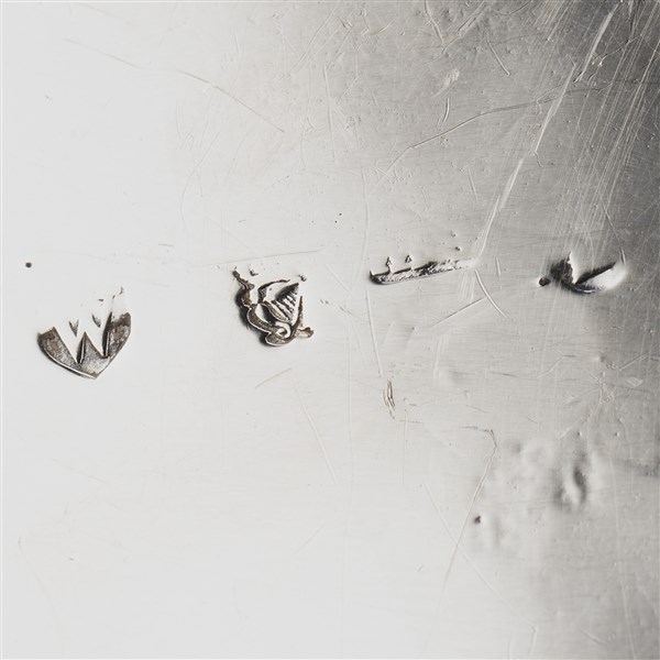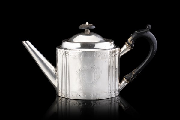 Caffettiera in argento a corpo liscio decorato da fasce incise a volute e centrato da stemmi. Ansa sagomata e presa del coperchio in legno ebanizzato. Punzoni di difficile lettura. Secolo XIX (h. cm 16) (g lordi 485) (difetti e restauri)