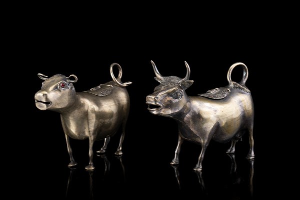 Lotto composto da due lattiere in argento a forma di mucca, di cui una con occhi in paste vitree. Epoche e punzoni differenti (cm max 14x10x5,5) (g lordi 320) (difetti e mancanze)