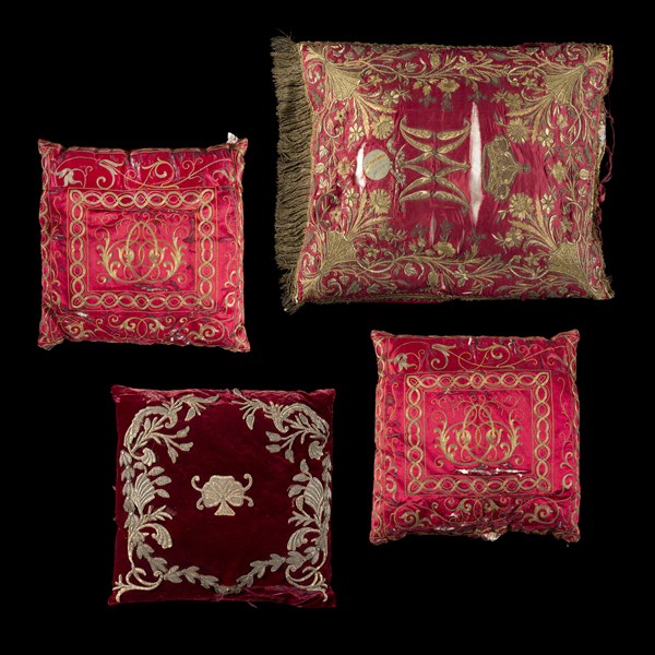 Four antique silk fabrics cushions, one in velvet, with silver-plated metal applications (defects)