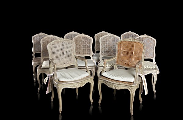 An 18th-century French dining room furniture comprising eight lacquered wooden chairs and two armchairs (defects and restorations)