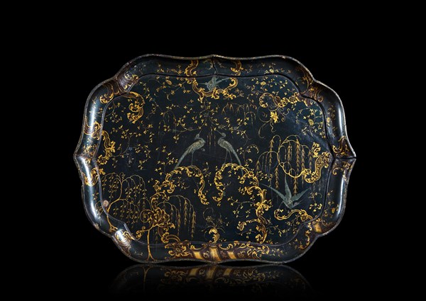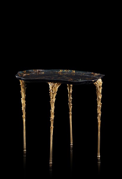 Tavolino da salotto con piano a vassoio in papier mâché decorato con aironi, insetti, fiori, foglie e volute dorate. Gambe in bronzo dorato e cesellato a motivi vegetali. Francia, secolo XIX (cm 81x45x60) (difetti)