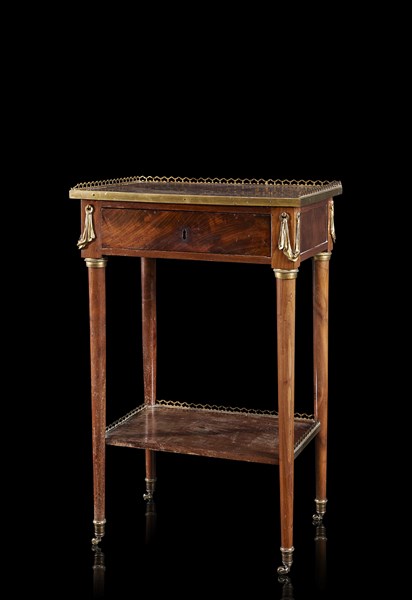 Tavolino lastronato in mogano, applicazioni in bronzo dorato e cassetto nella fascia. Gambe a colonnina riunite da pianetto, munite di rotelle. I piani incassati e profilati da ringhiere traforate. Reca stampigliatura sottopiano Charles Topino (1742-1803) Francia, secolo XVIII (cm 47x34x76) (difetti)