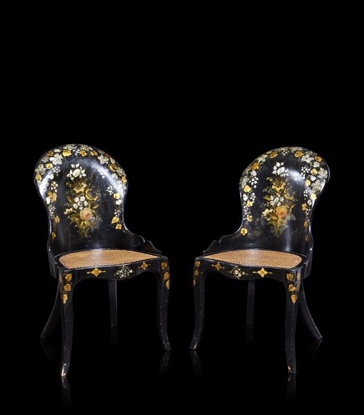Coppia di sedie in legno ebanizzato decorato in policromia e madreperla a mazzi fioriti e grappoli d'uva. Gambe anteriori mosse e posteriori a sciabola. Seduta incannucciata. Inghilterra, secolo XIX (difetti)