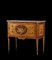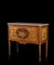 Commode in legno intarsiato e filettato in varie essenze. Fronte centrato da ovale a strumenti musicali entro ghirlande, fianchi da mazzi fioriti con inserti in avorio e madreperla. Montanti a finte scanalature. Piano in marmo sagomato. Francia, fine secolo XVIII (cm 97,5x42x86) (difetti e mancanze)