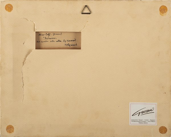 "Scirocco" late 50s . Oil on panel (cm 17x23,5) signed and titled at the bottom, inscribed on the back. In frame (minor defects)